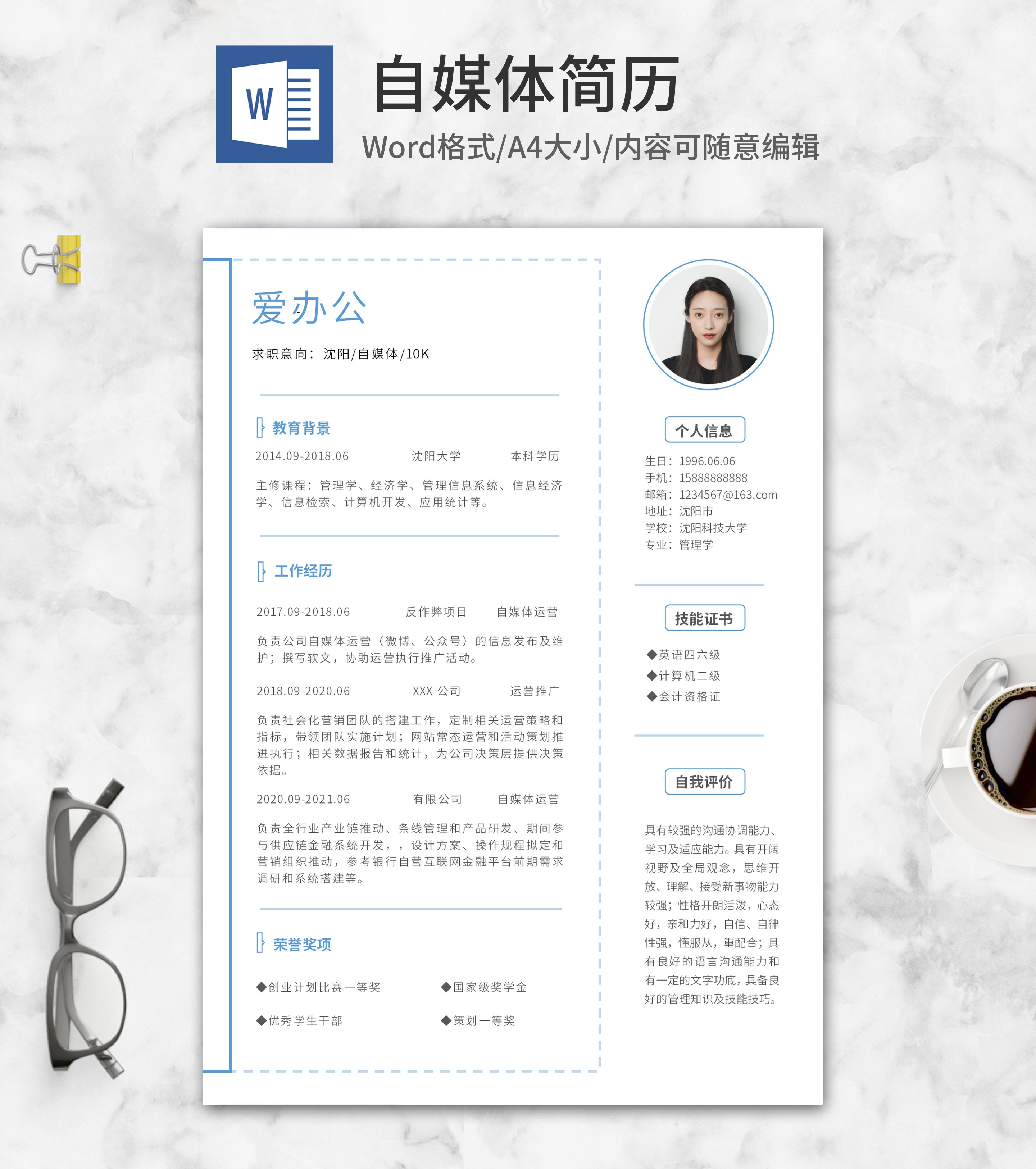 简约风蓝色自媒体简历word模板