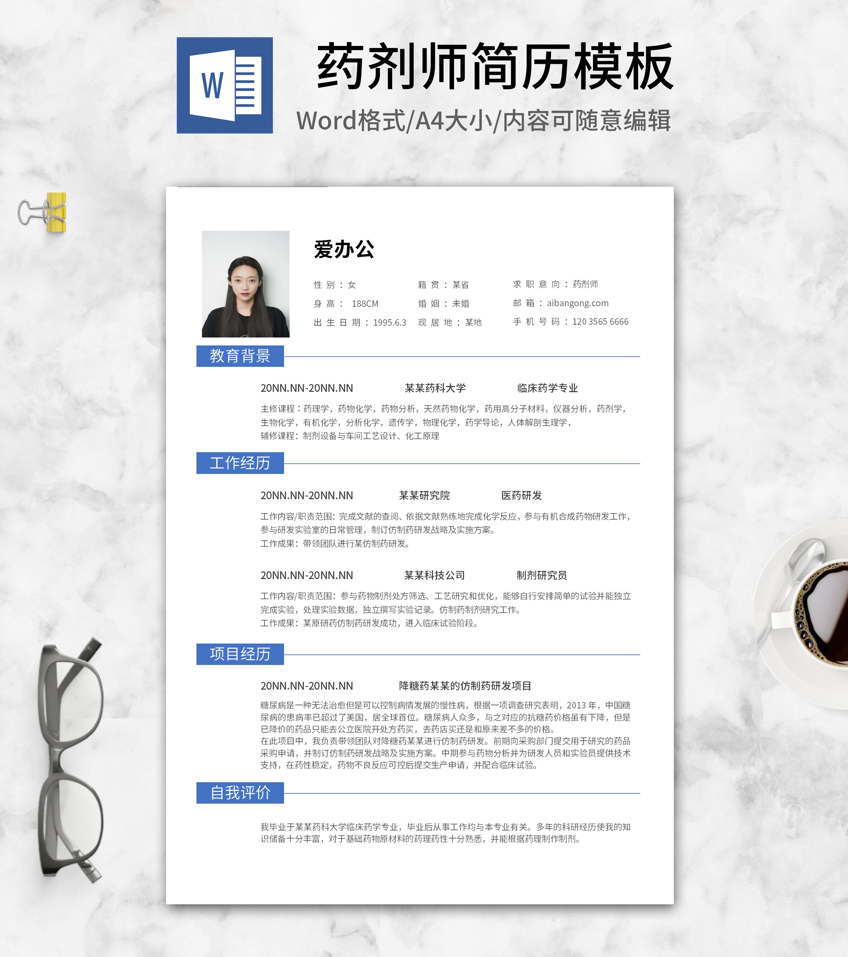 蓝色药剂师求职简历word模板