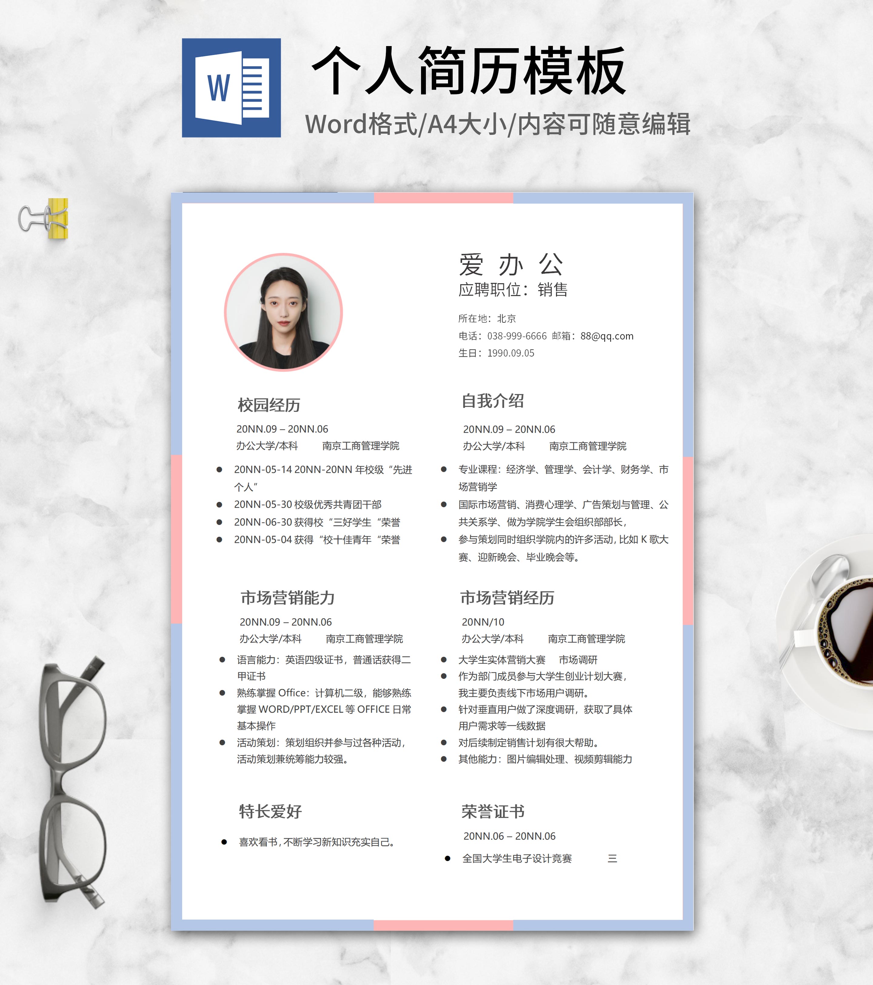 蓝粉销售求职简历word模板