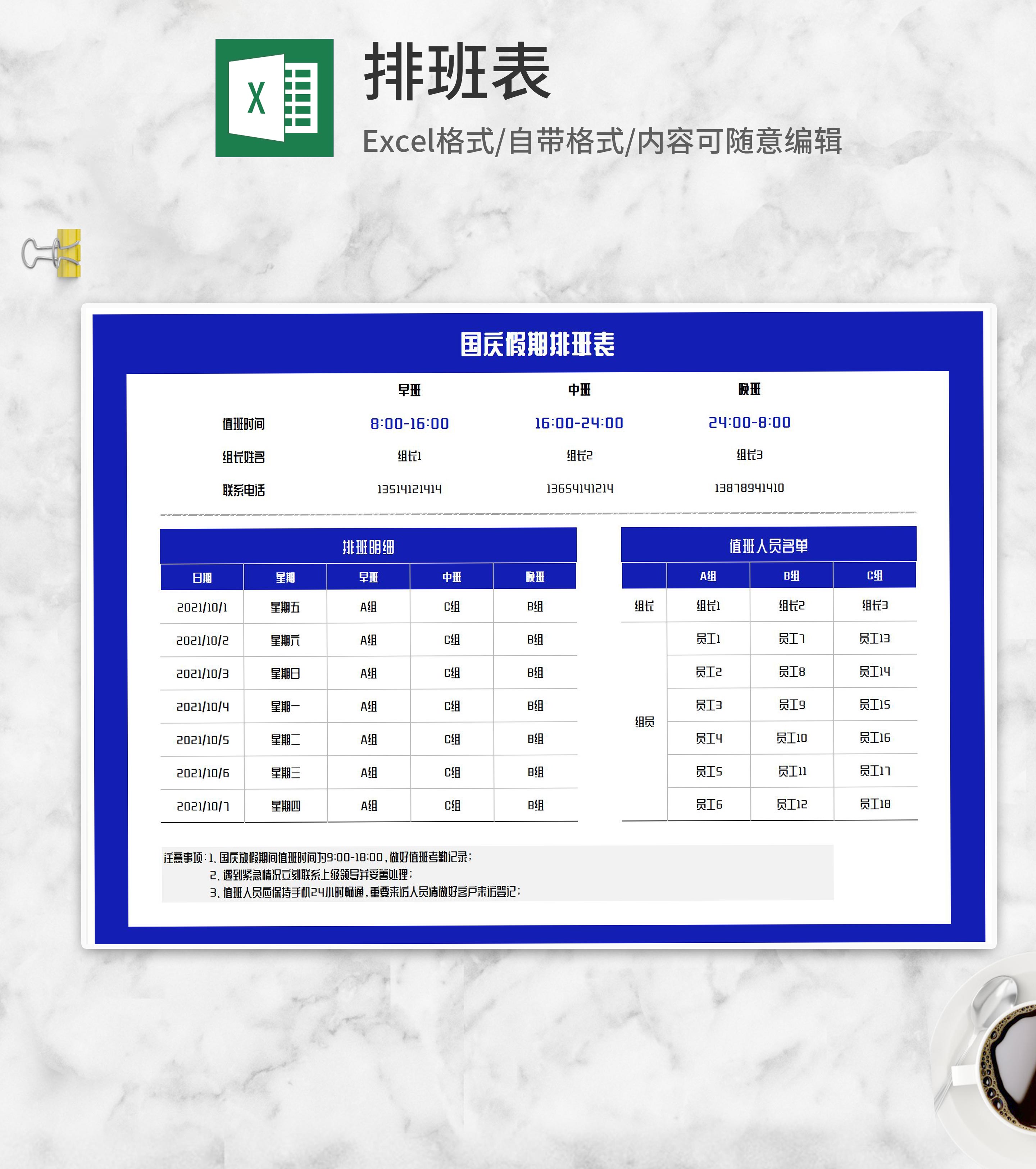 国庆假期团队排班表Excel模板