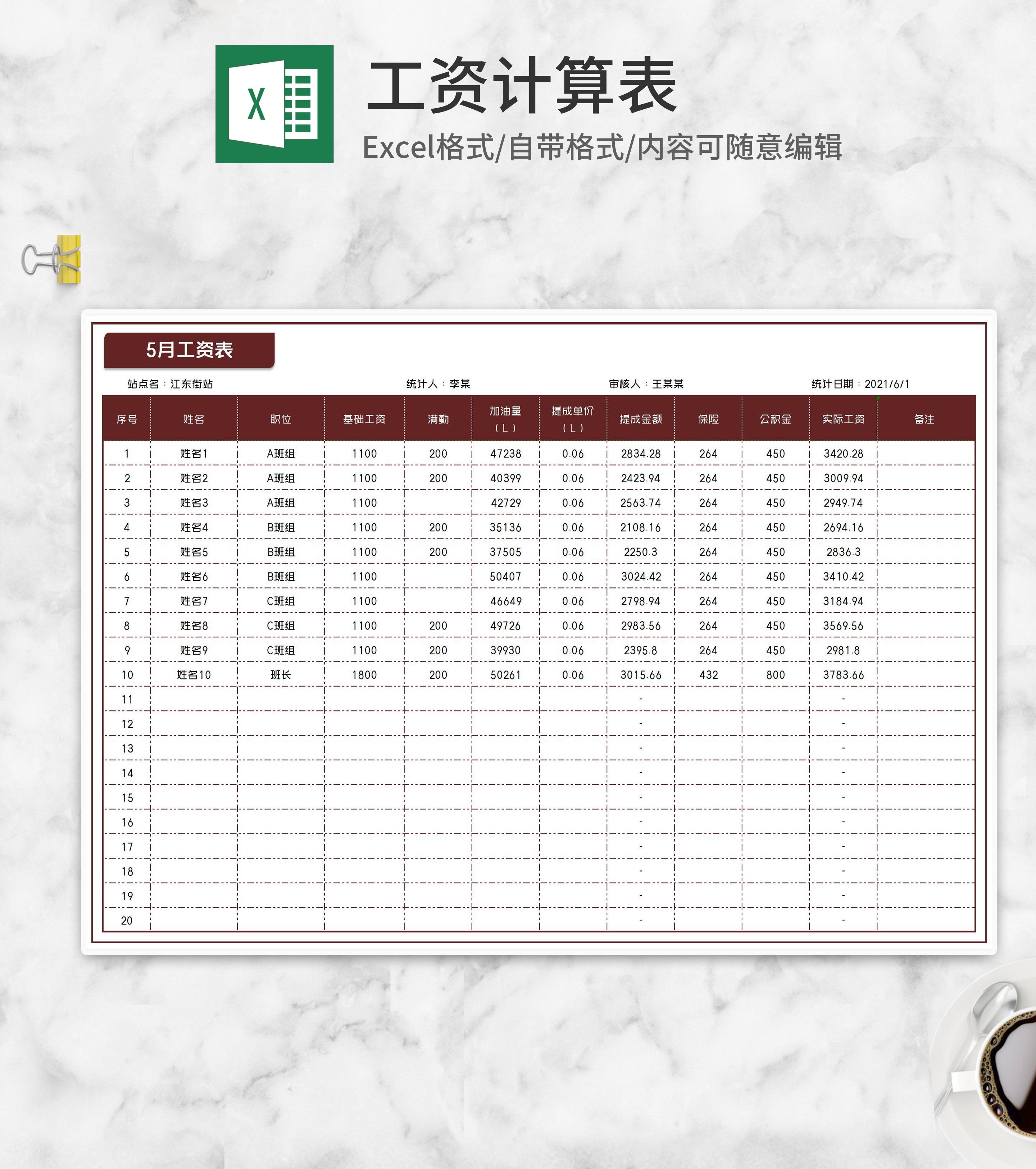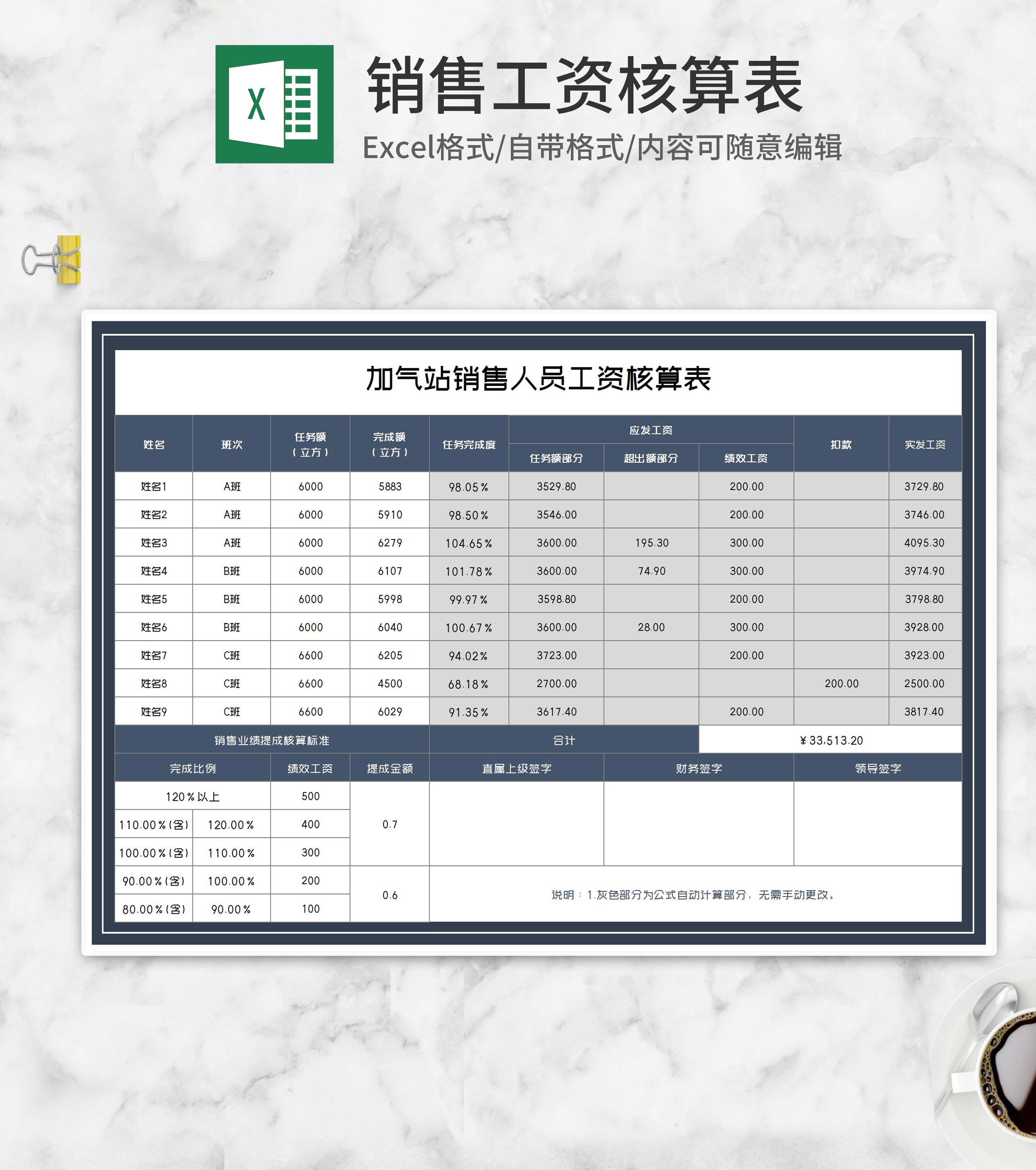 加气站销售人员工资核算表Excel模板