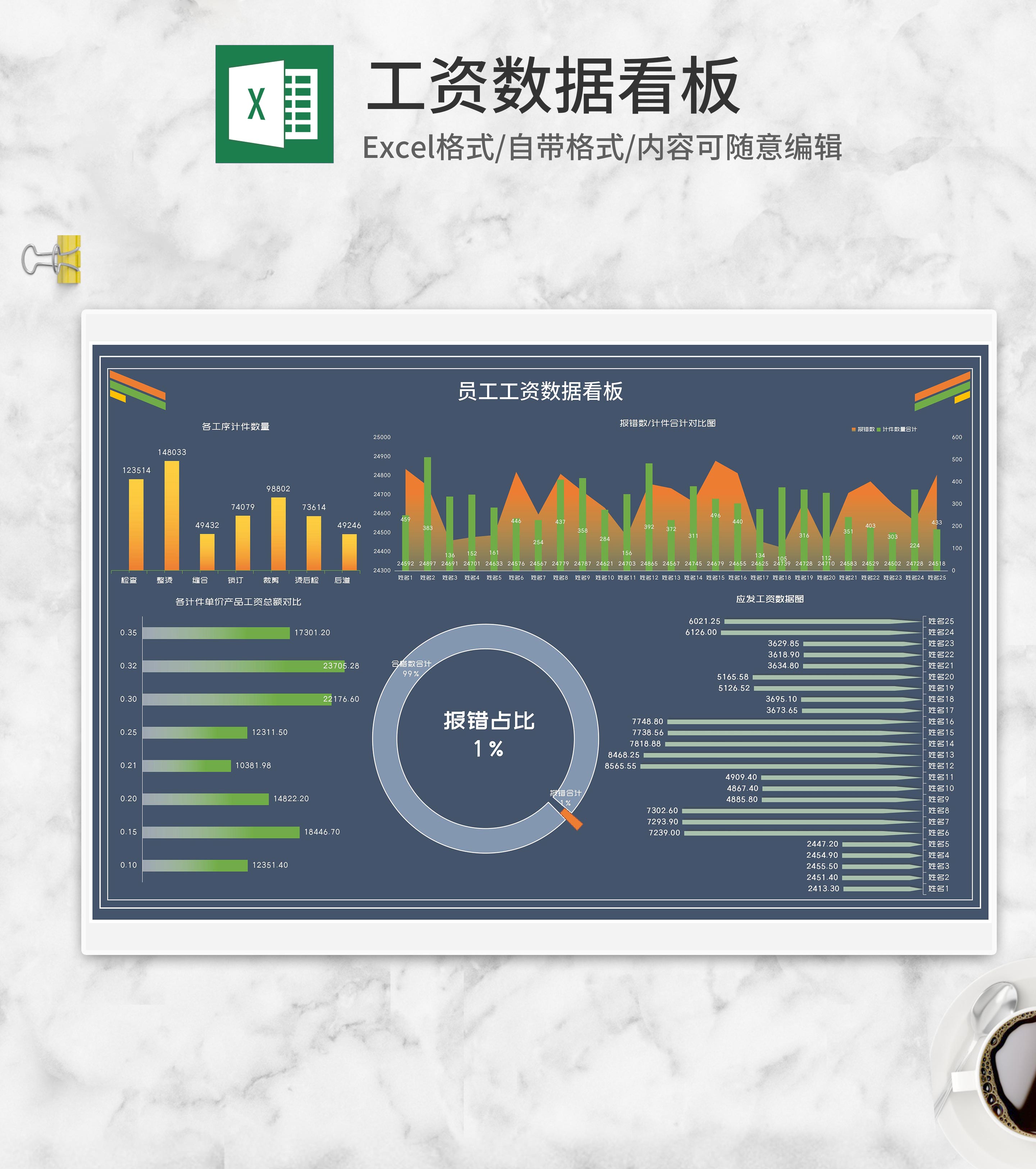 员工计件工资数据看板Excel模板