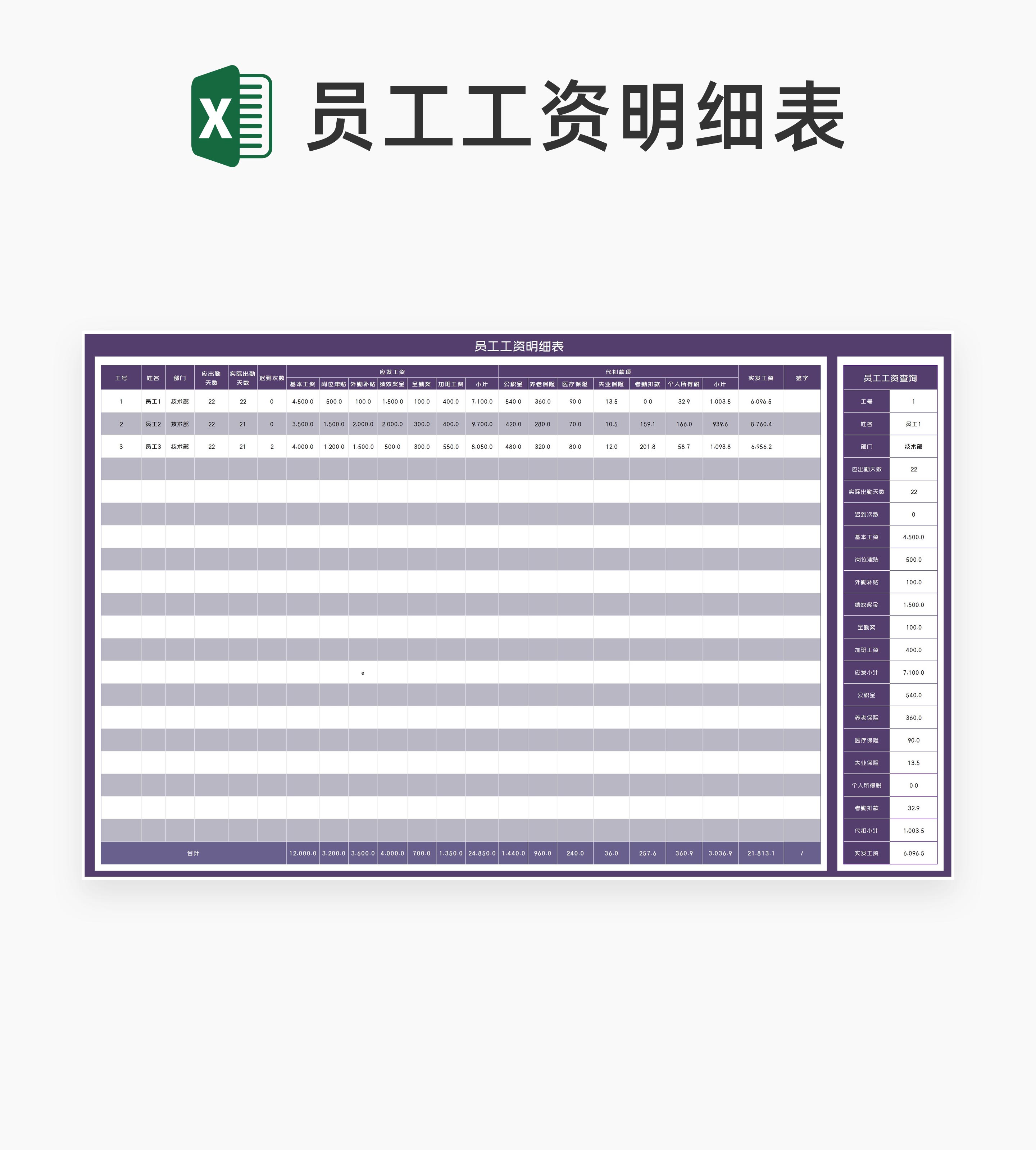 紫色员工工资查询明细表Excel模板