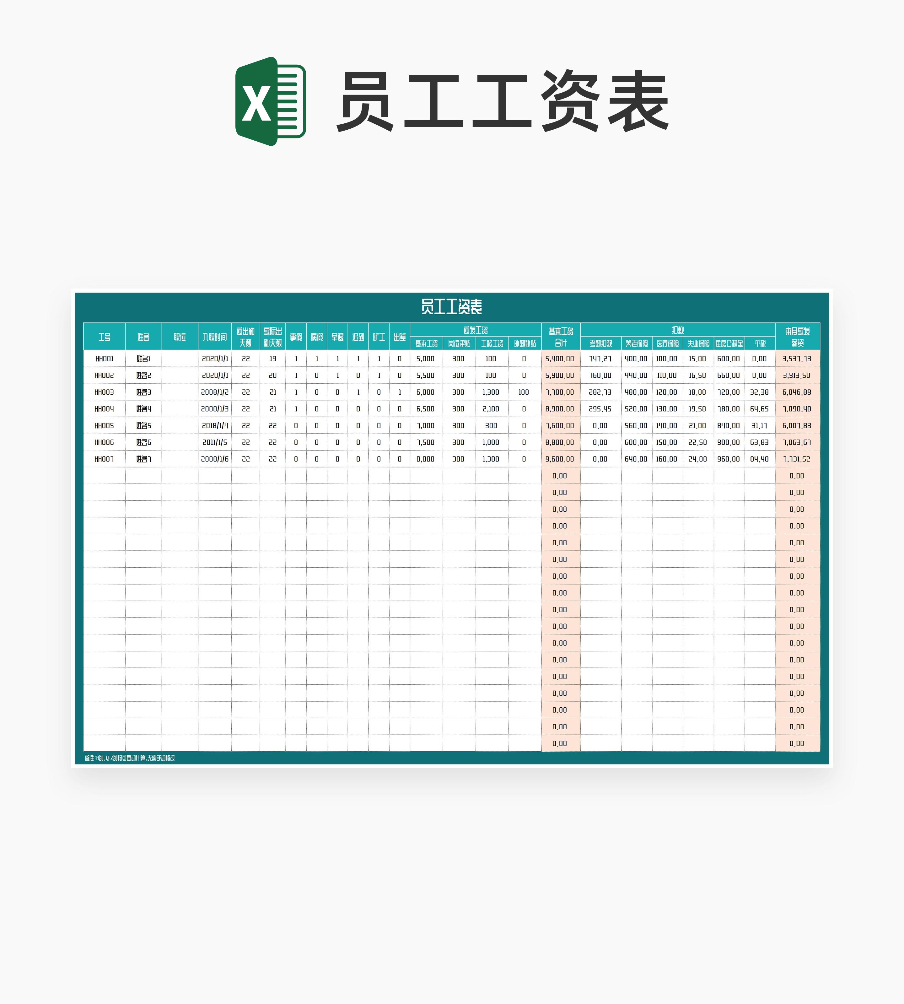公司岗位员工工资考勤表Excel模板