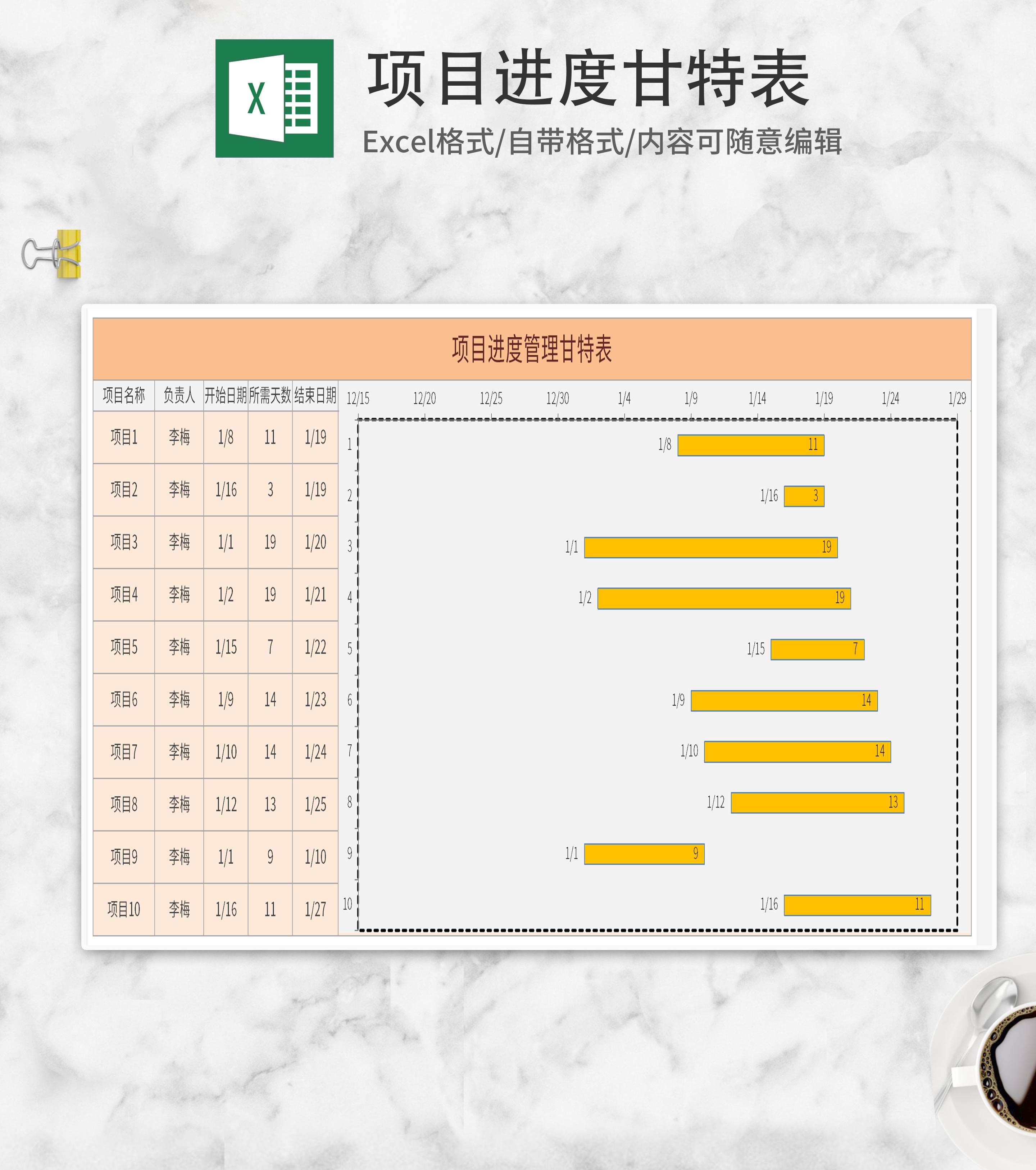 黄色项目进度甘特表Excel模板