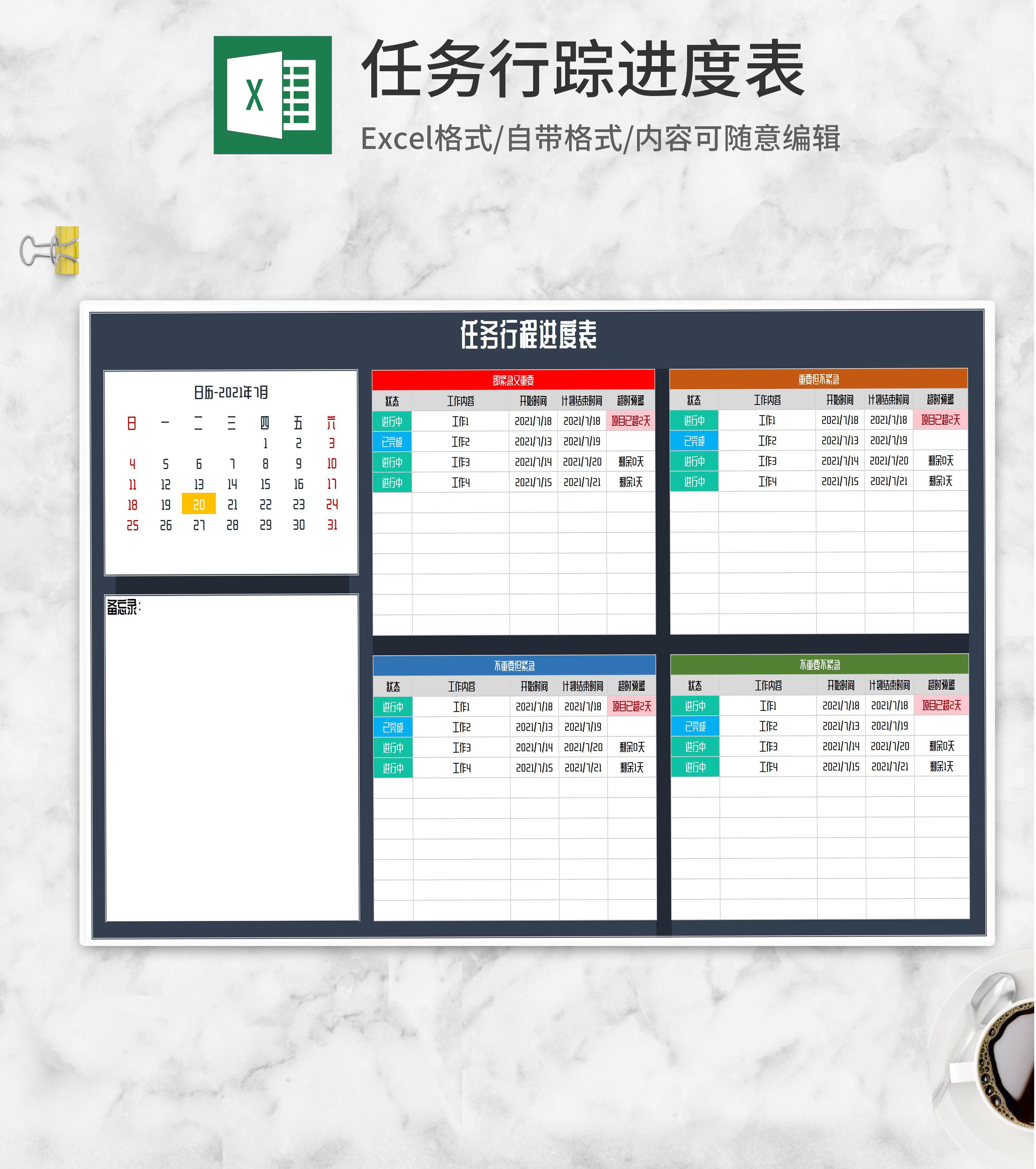任务行程等级分类进度表Excel模板