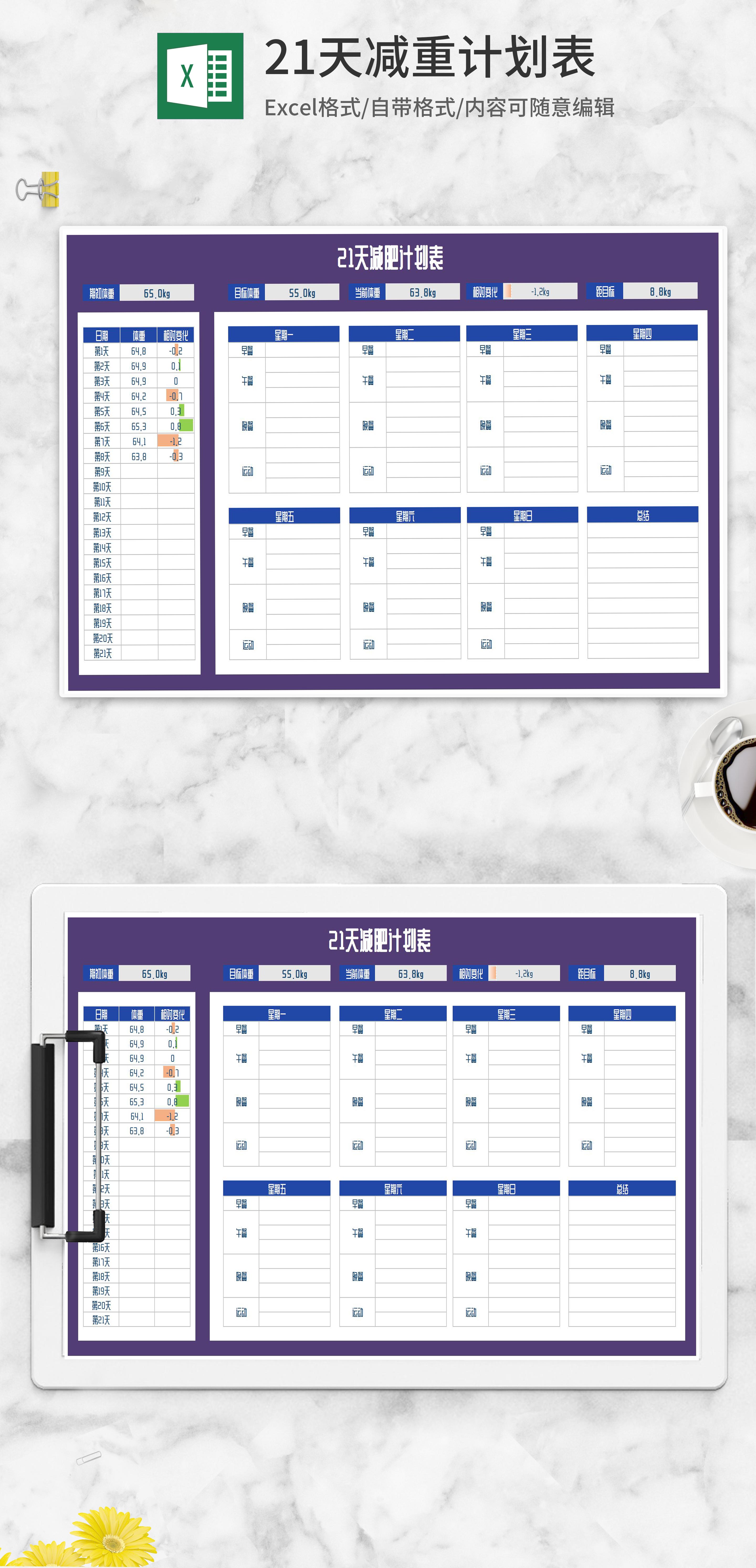 21天减重计划安排表Excel模板