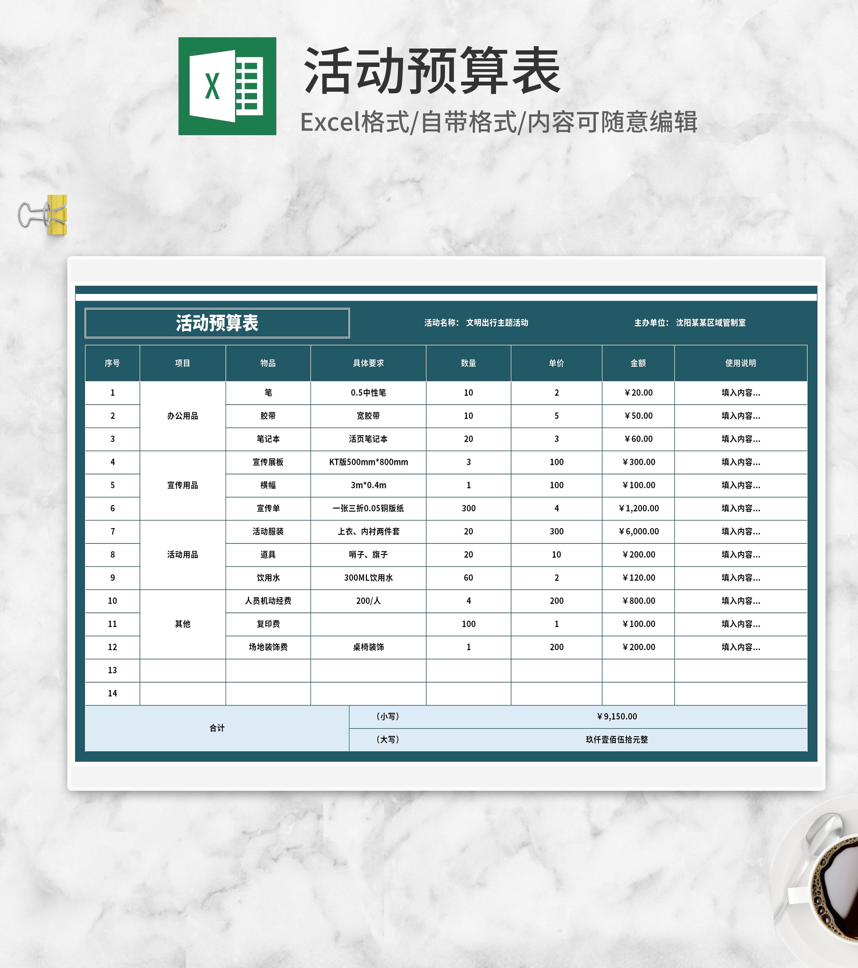 文明出行主题活动费用预算表Excel模板