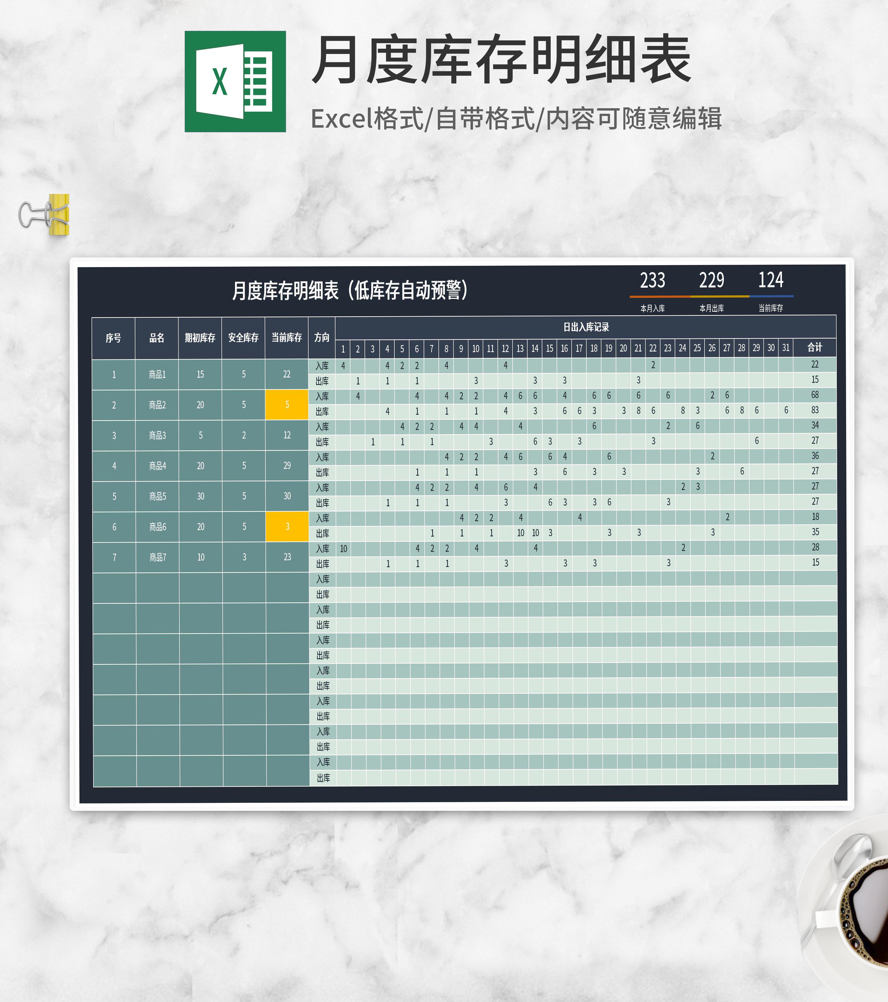 月度商品库存记录明细表Excel模板