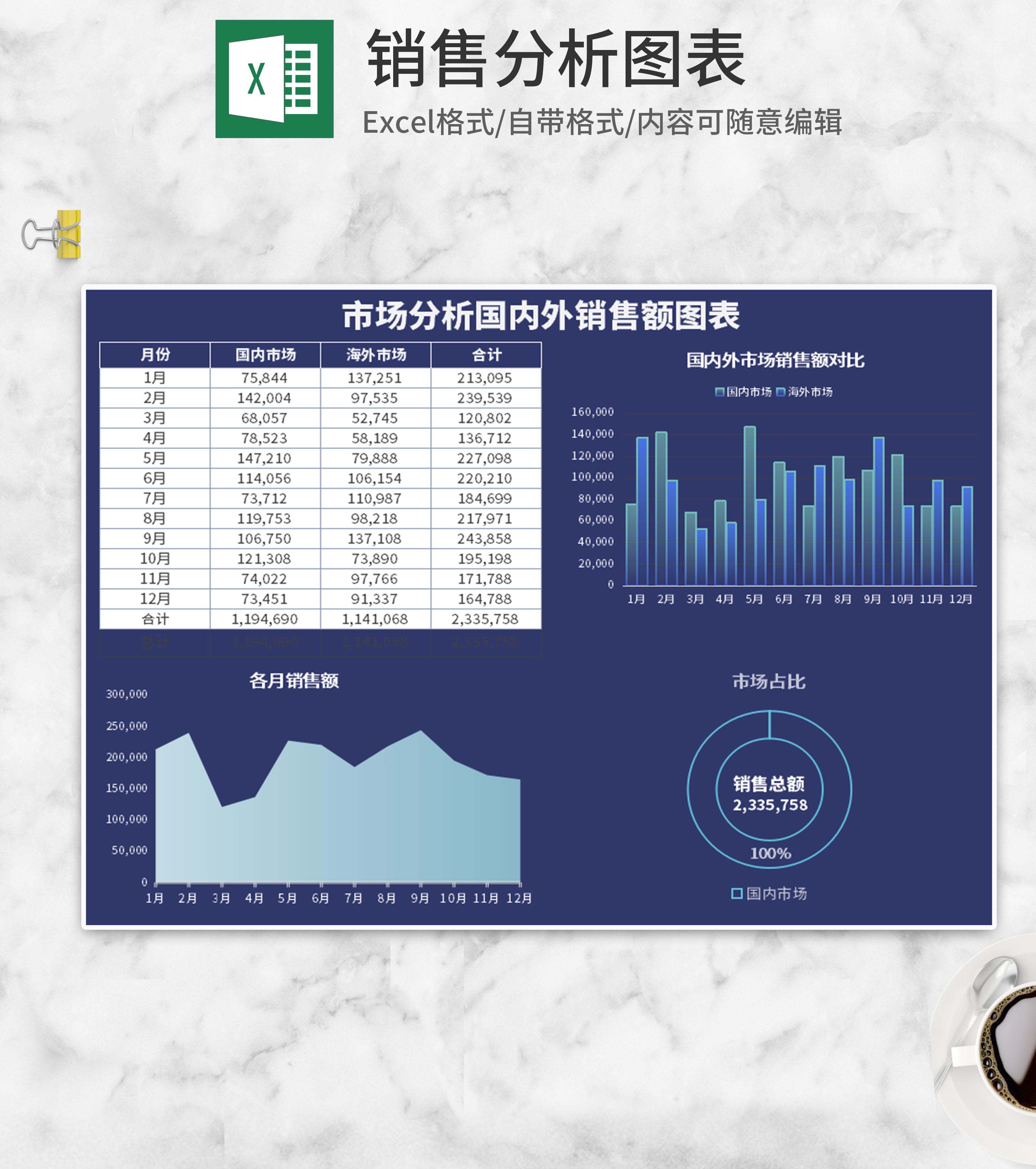 蓝色国内外市场销售额分析图表Excel模板