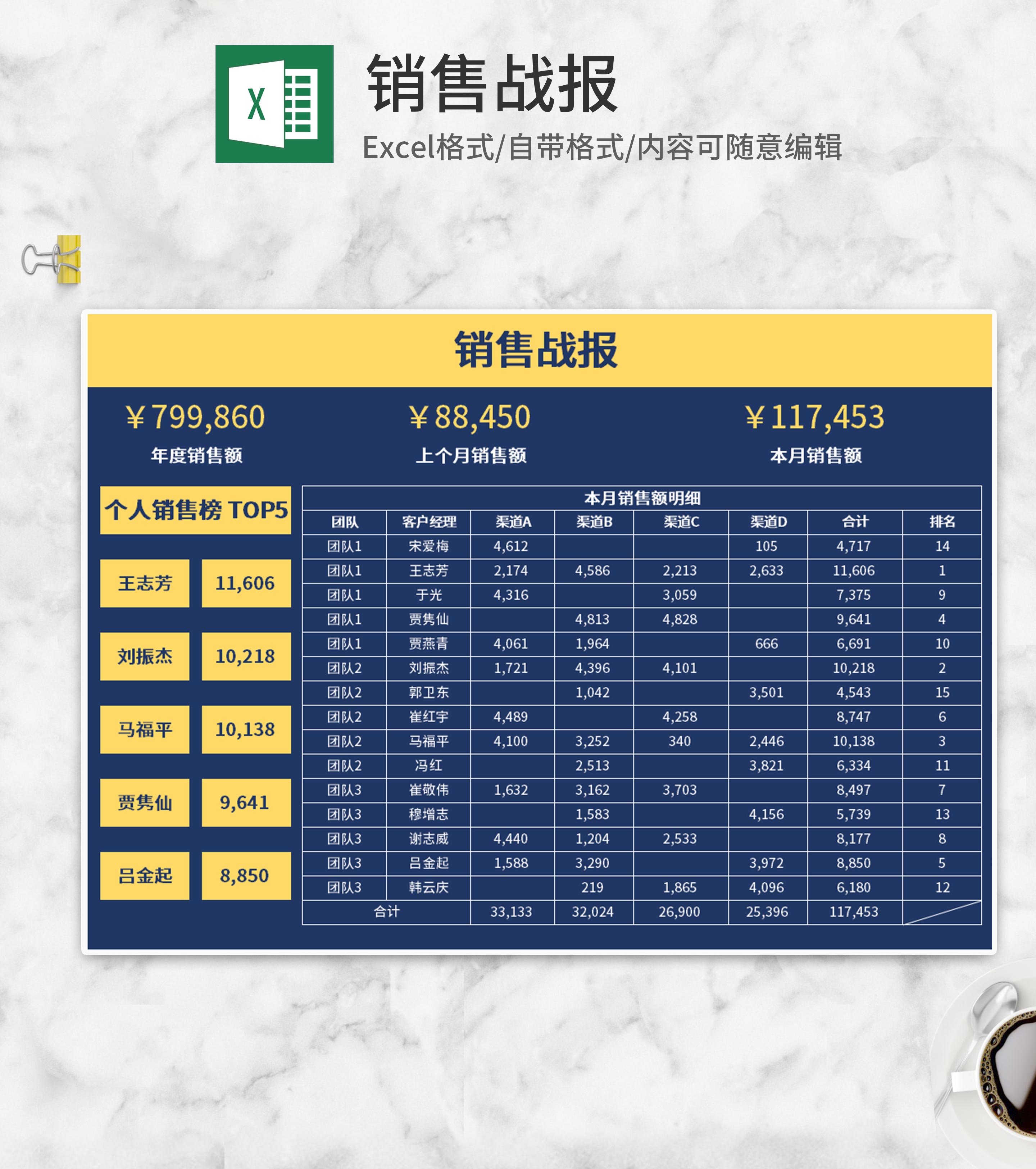 蓝黄双色销售战报Excel模板