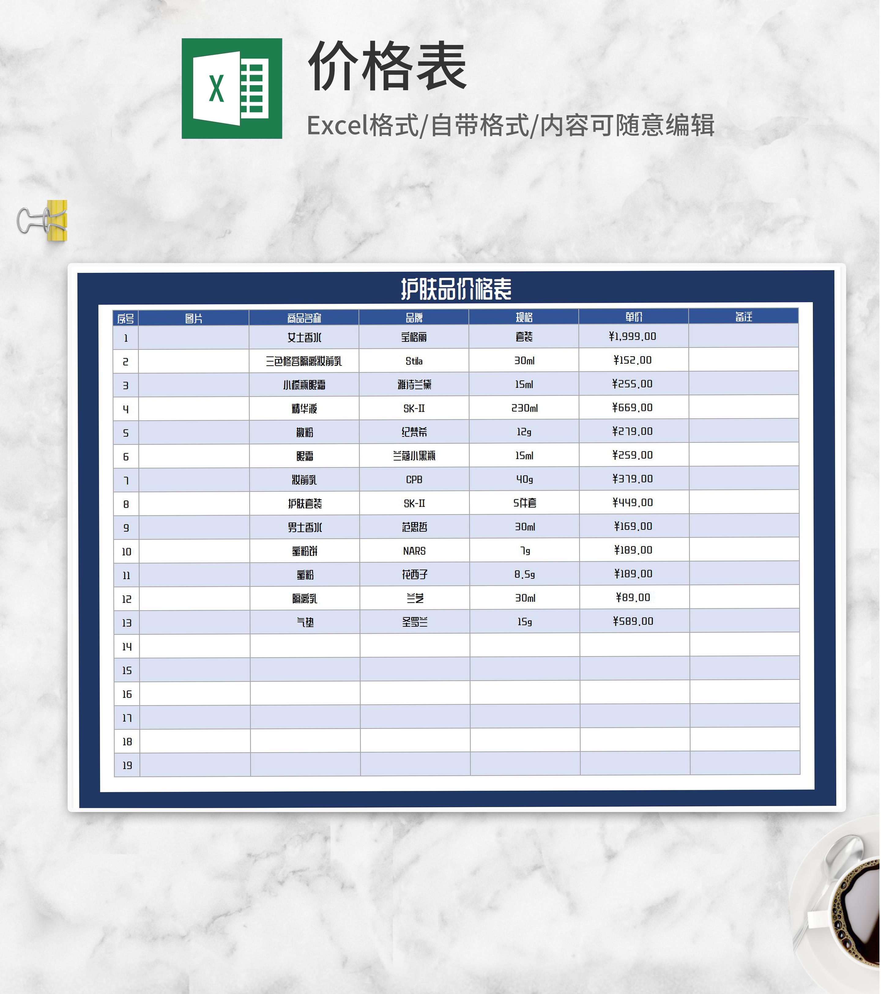 护肤品价格明细表Excel模板