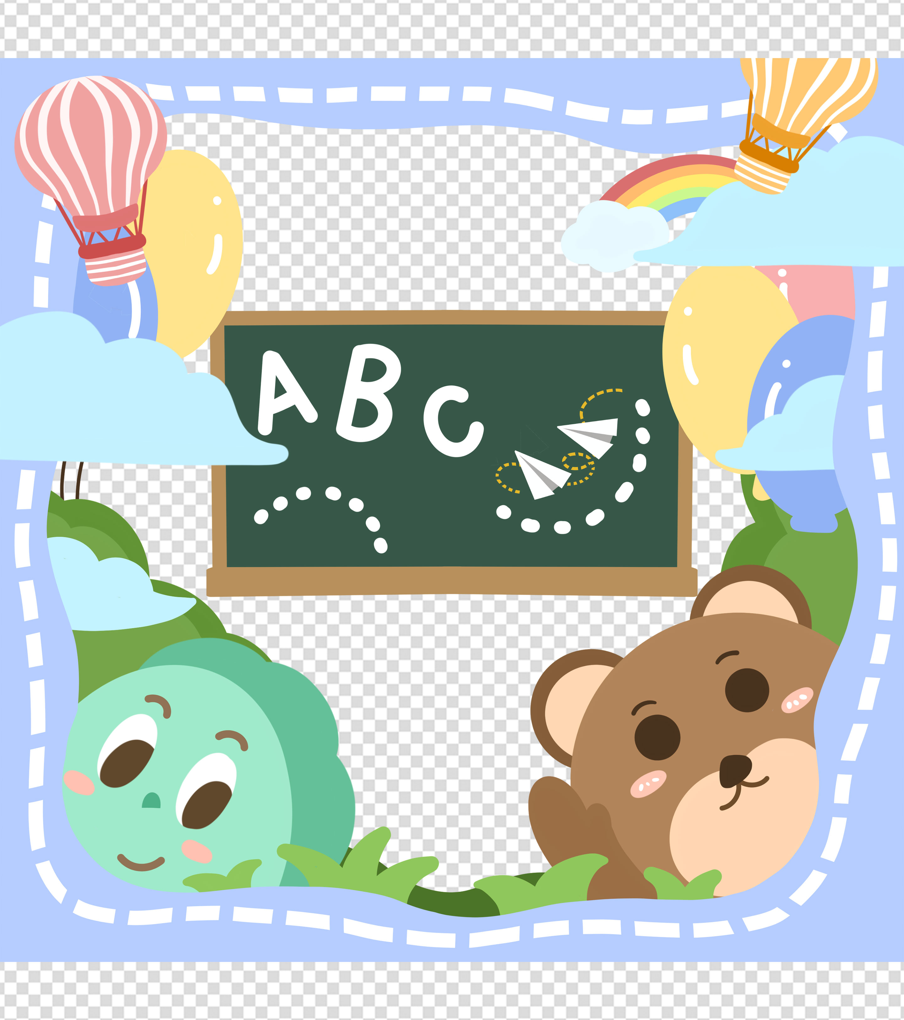 卡通蓝色热气球黑板学校装饰元素