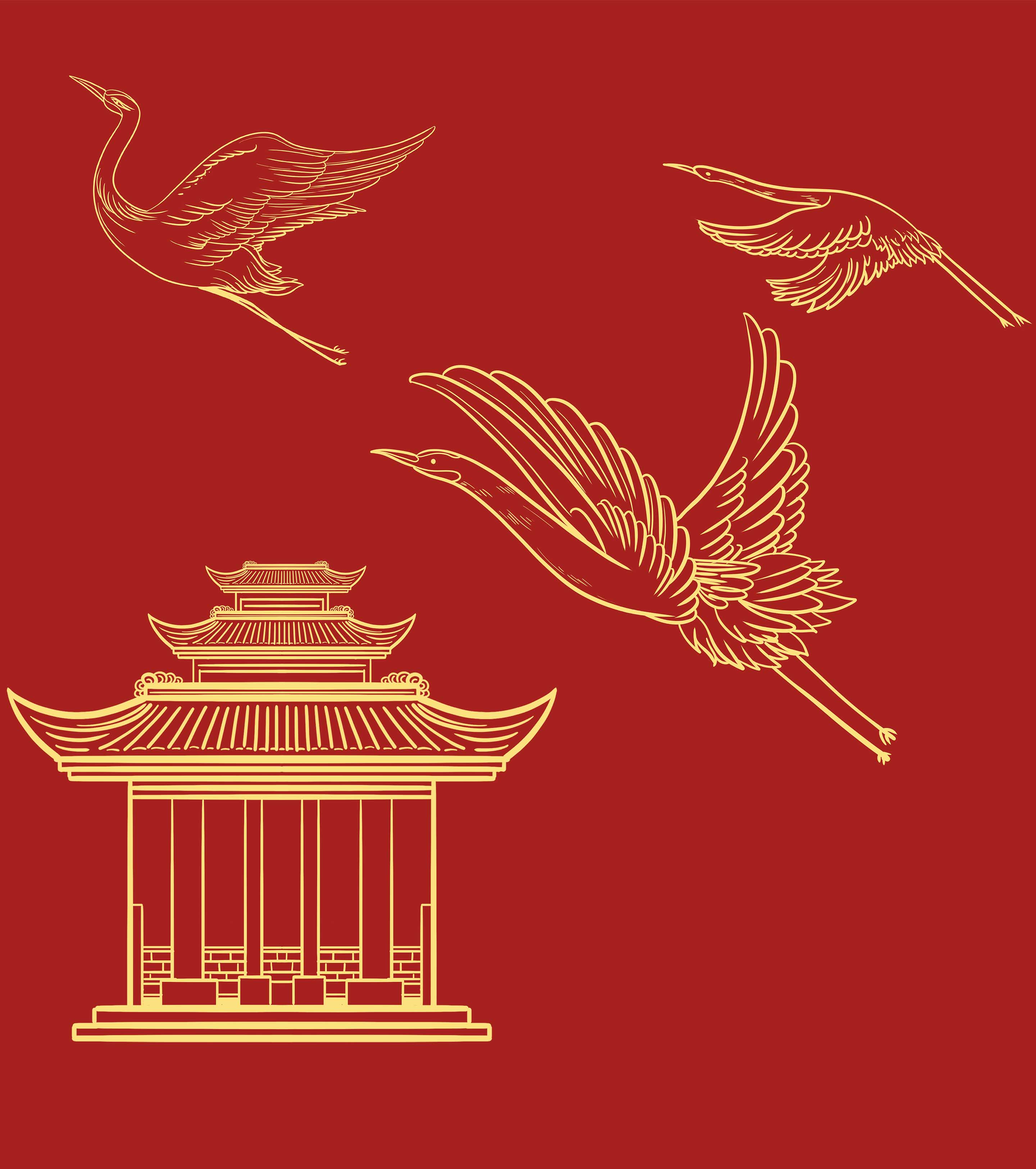 卡通中国风红色鹤凉亭元素