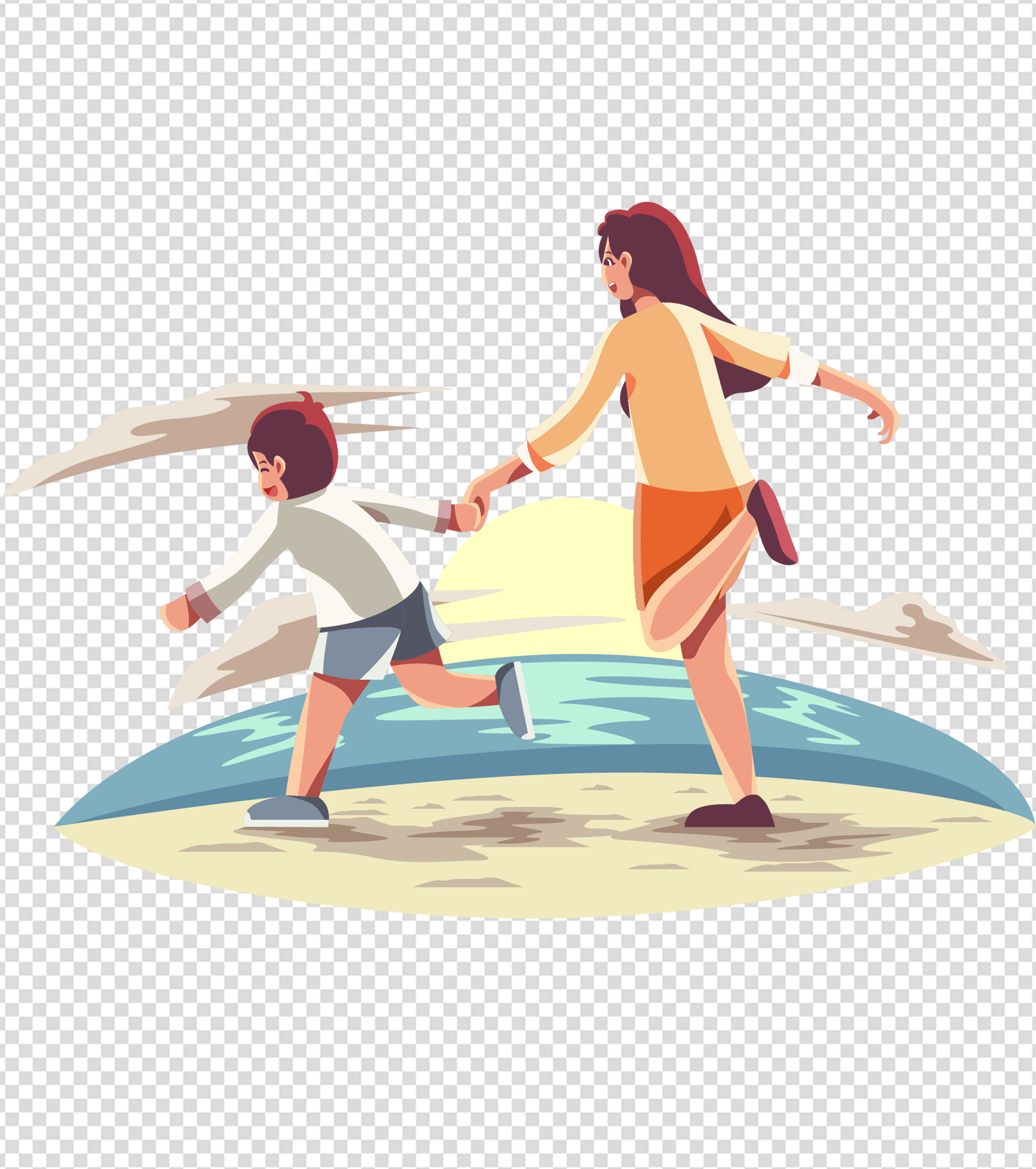 夕阳母子海边奔跑元素