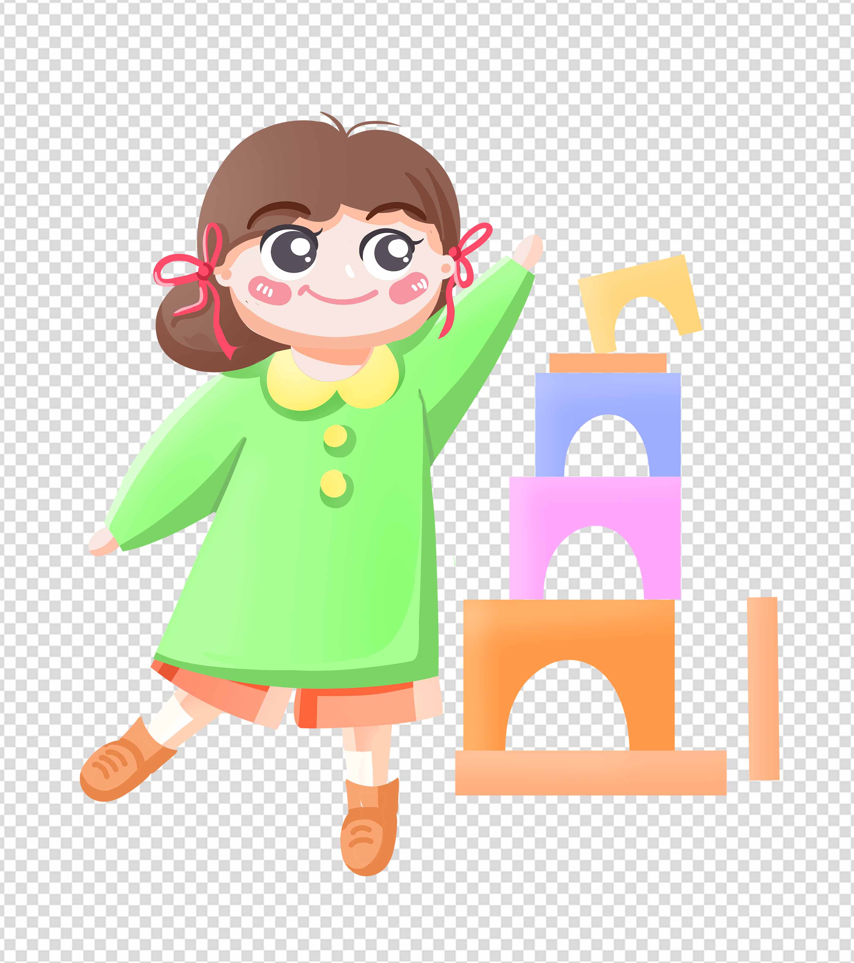 卡通绿色小女孩积木幼儿园元素