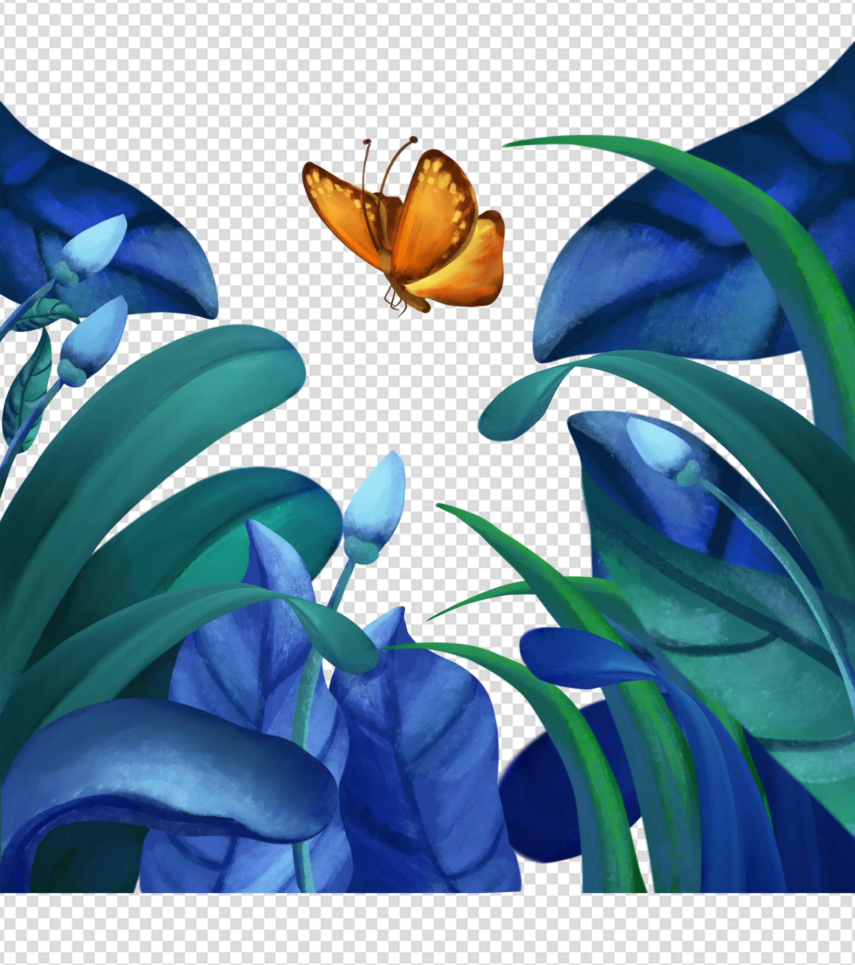 ppt元素原创蓝色草丛蝴蝶飞舞装饰