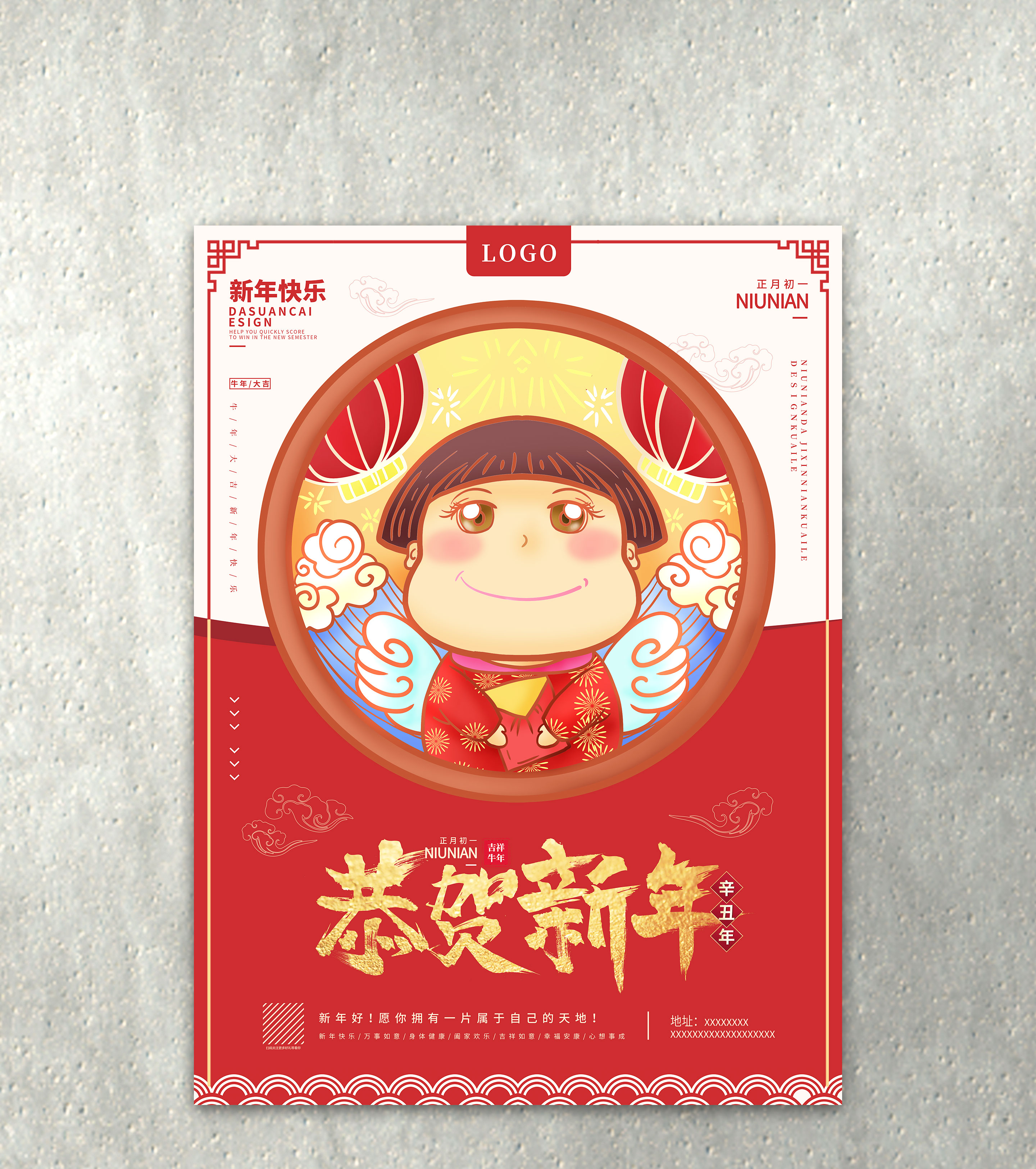 红色中式女孩恭贺新春海报