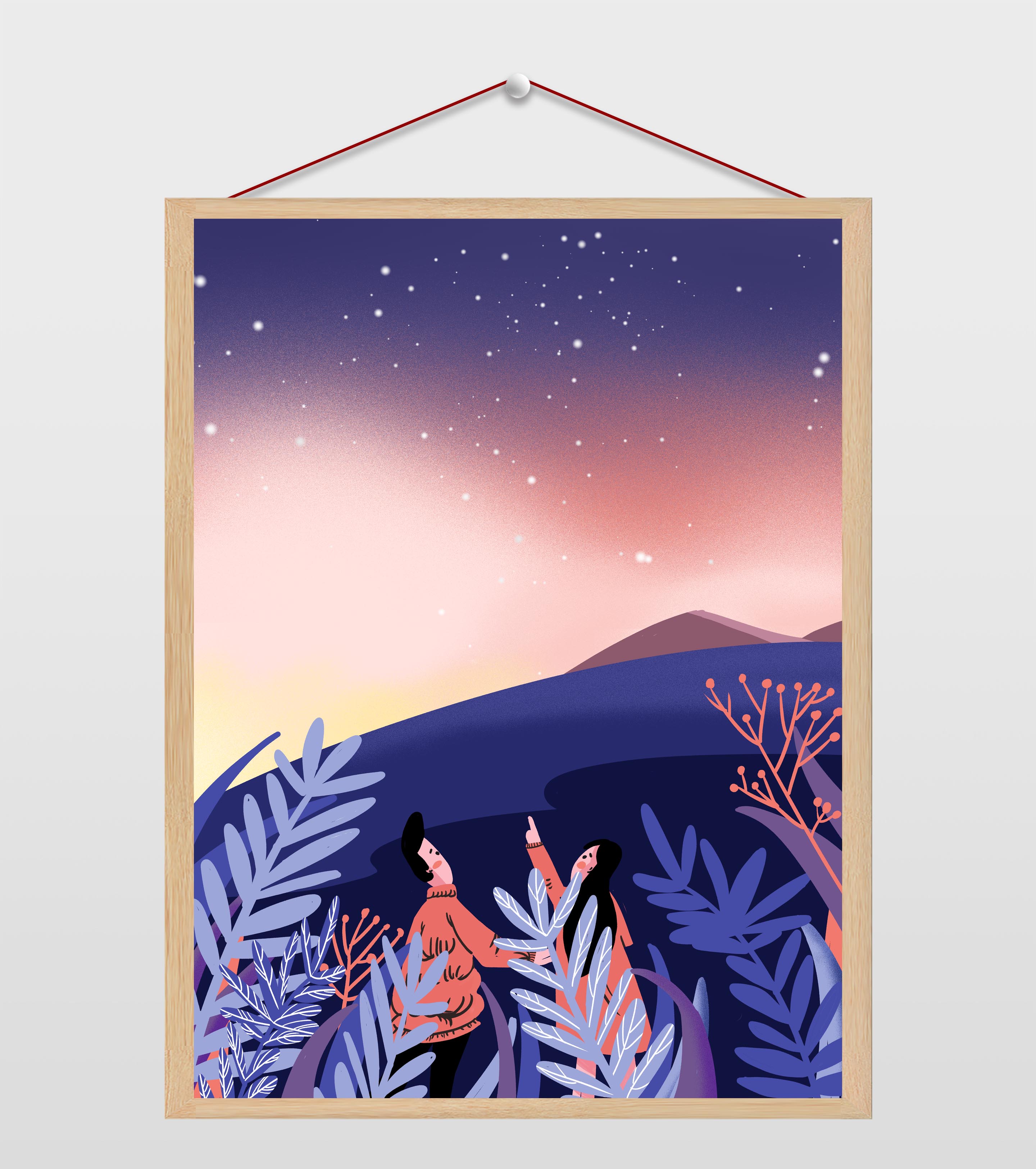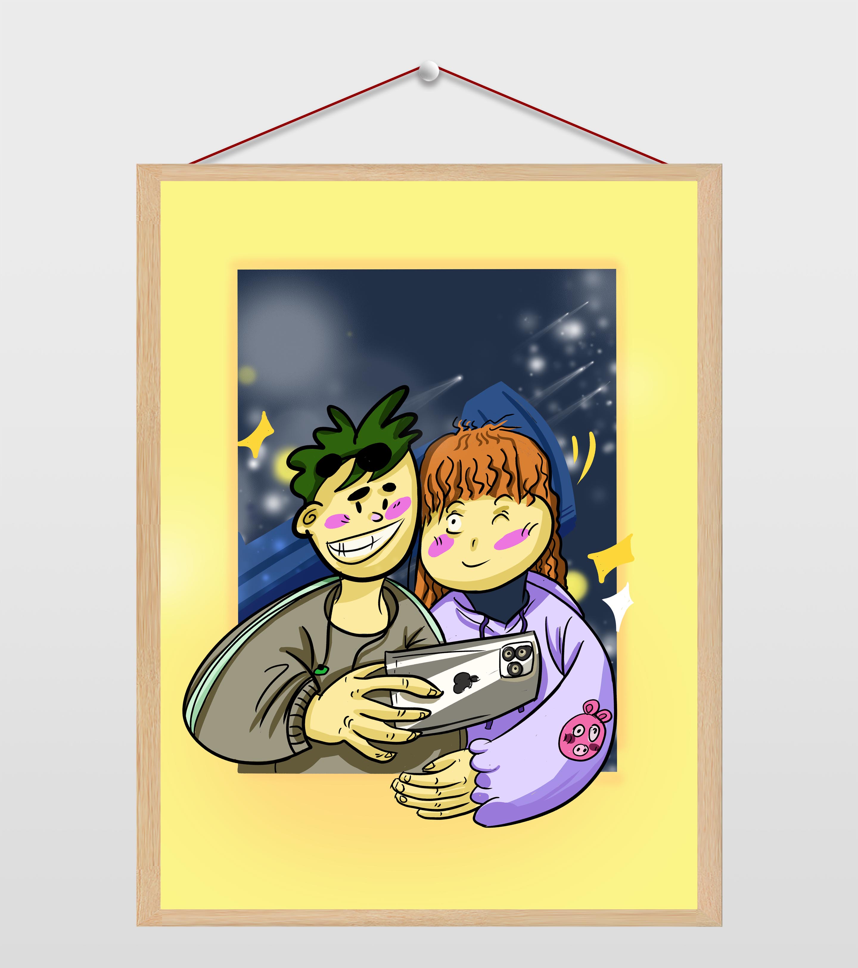 星空背景情侣自拍插画