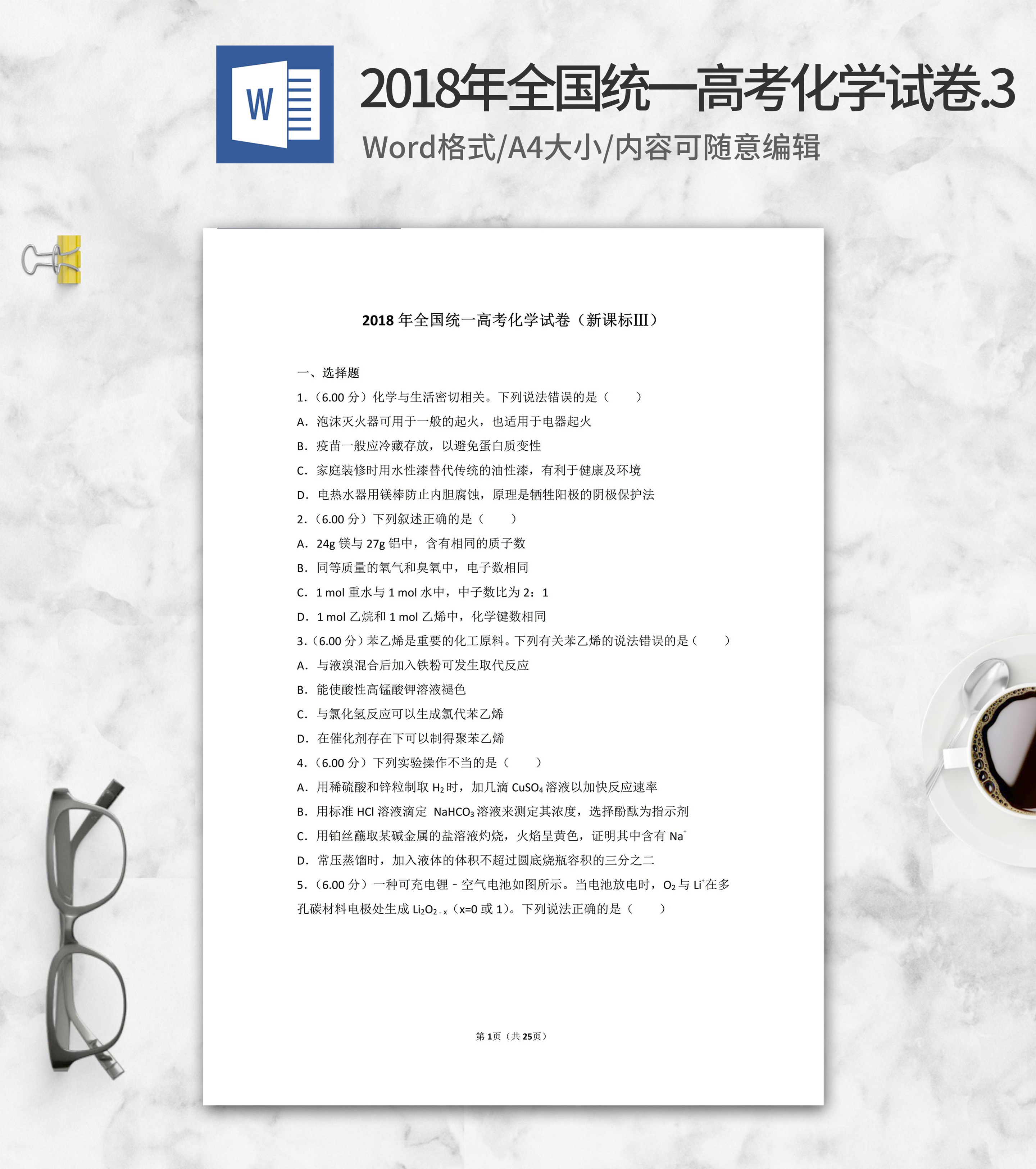 2018年全国统一高考化学试卷新课标3word模板