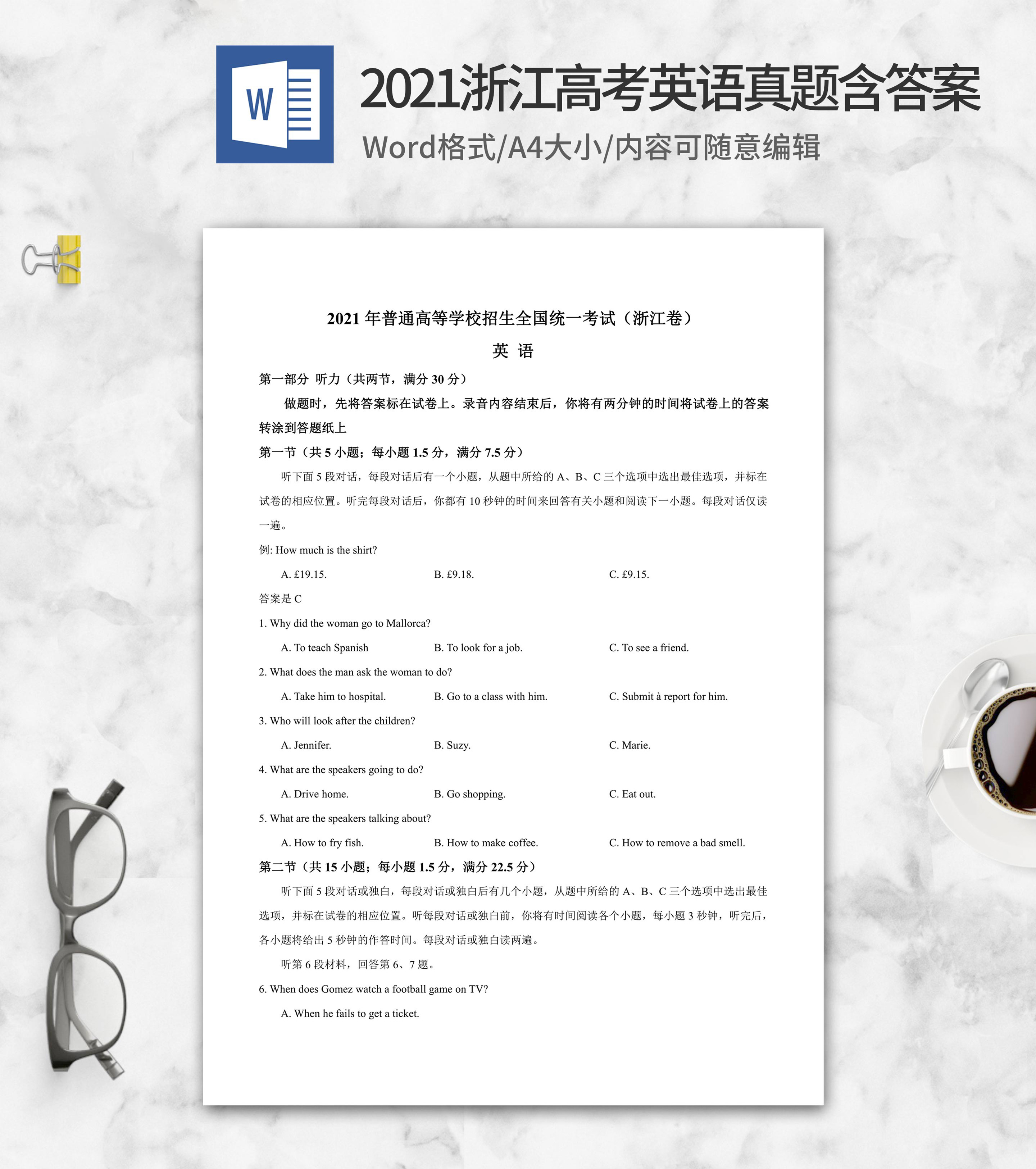 2019年普通高等学校考试英语浙江卷word模板