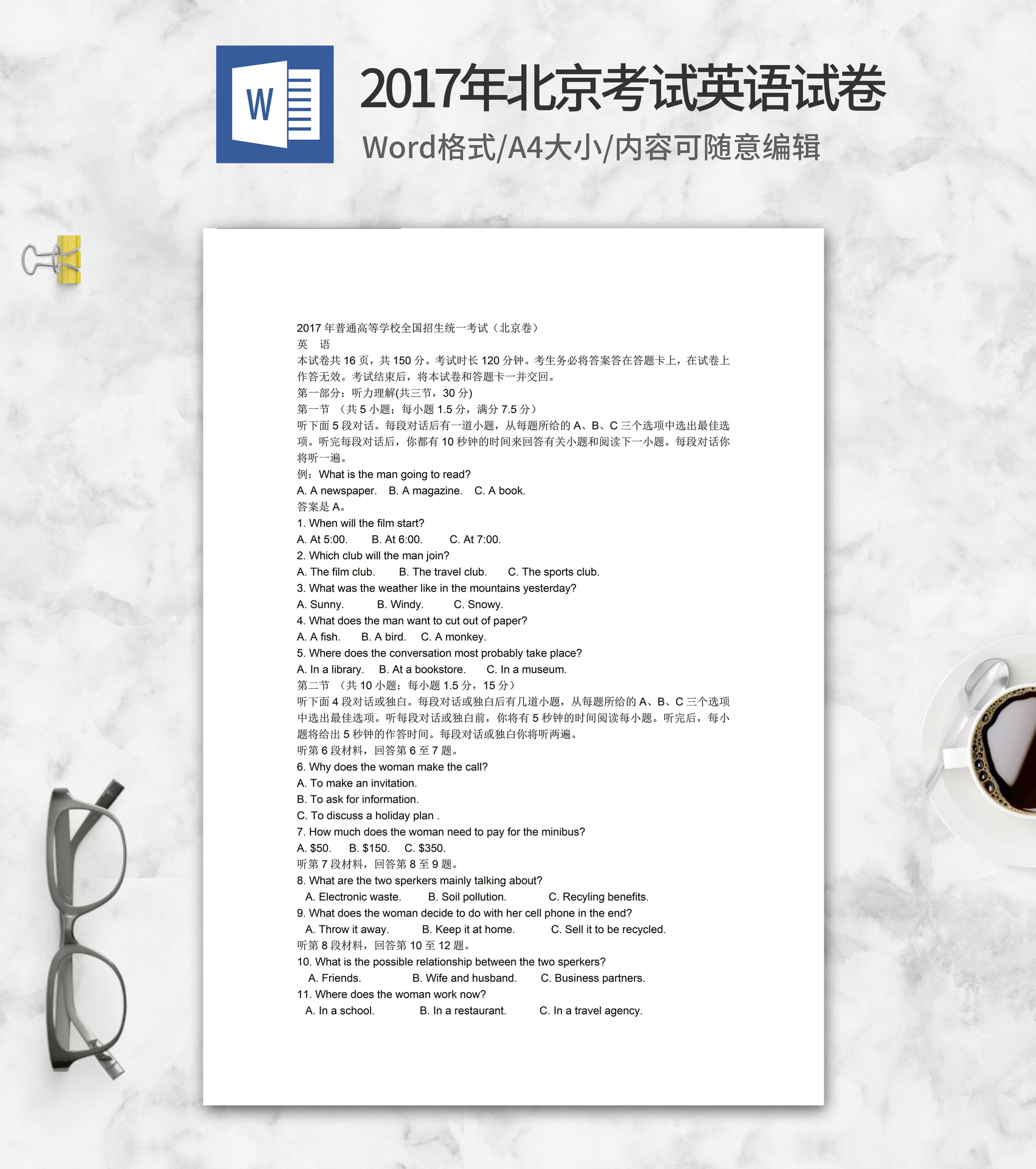 2017年北京市高考语文试卷答案word模板