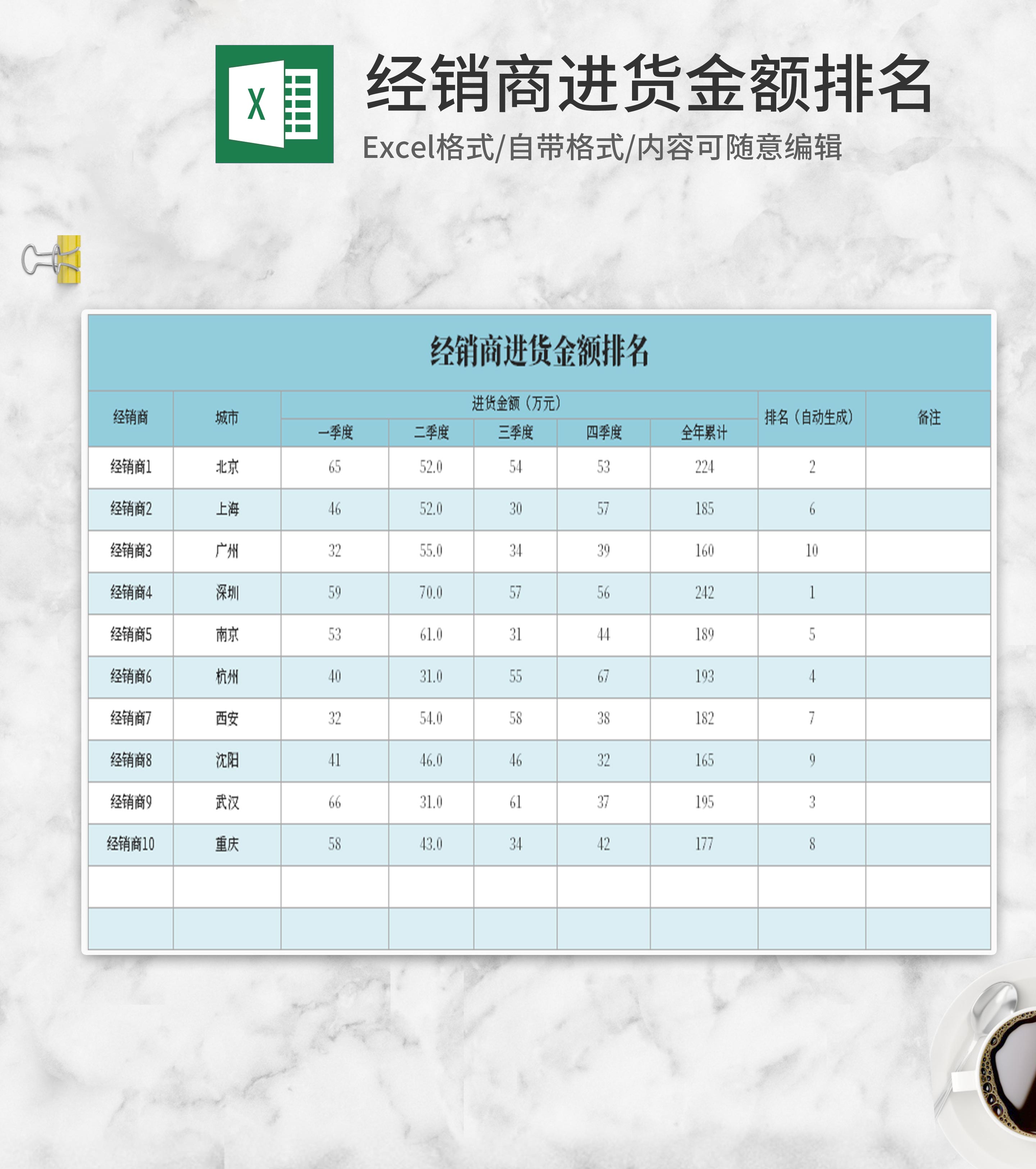 简约蓝色经销商进货金额排名Excel模板