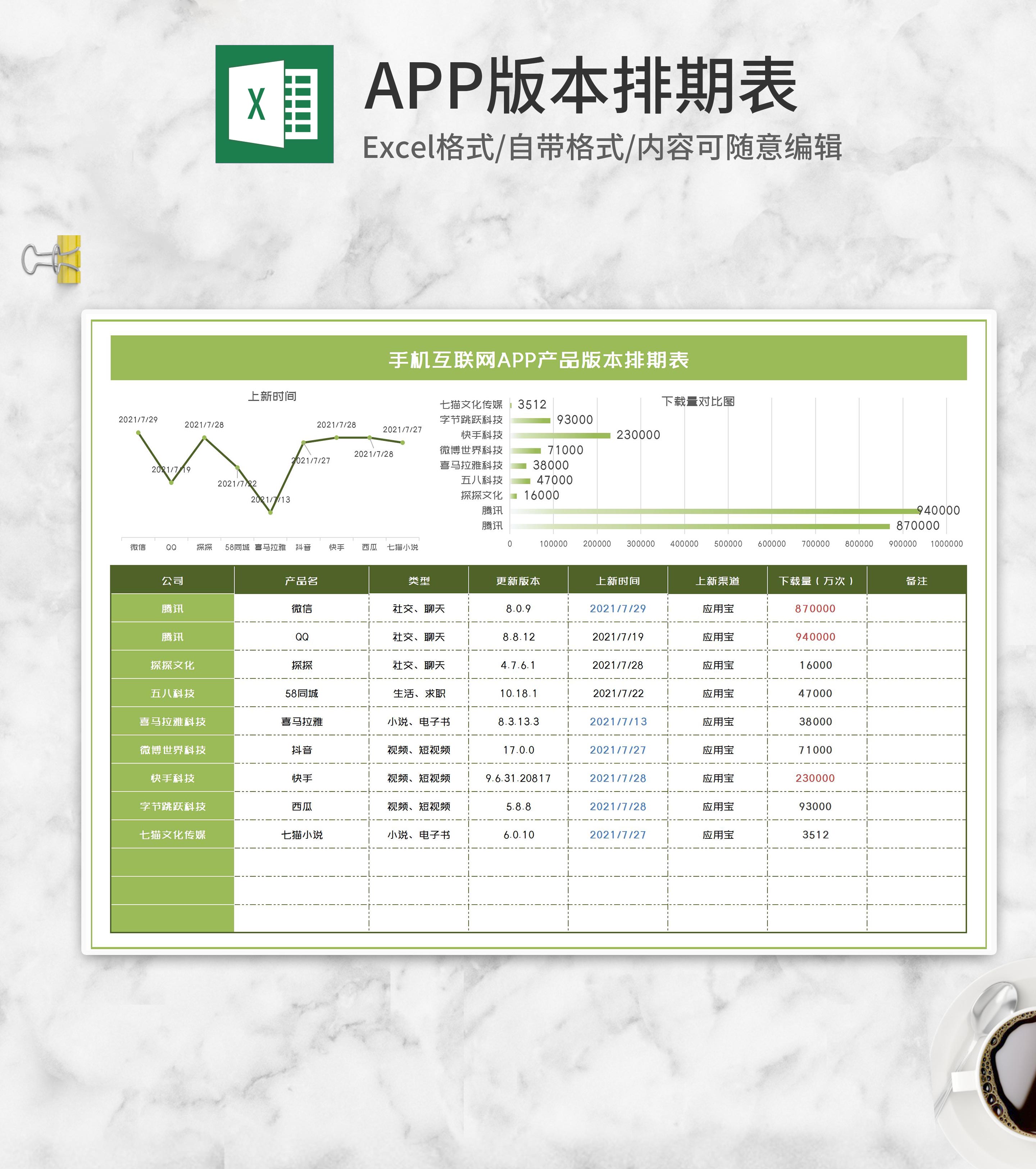 手机互联网APP产品版本排期表Excel模板