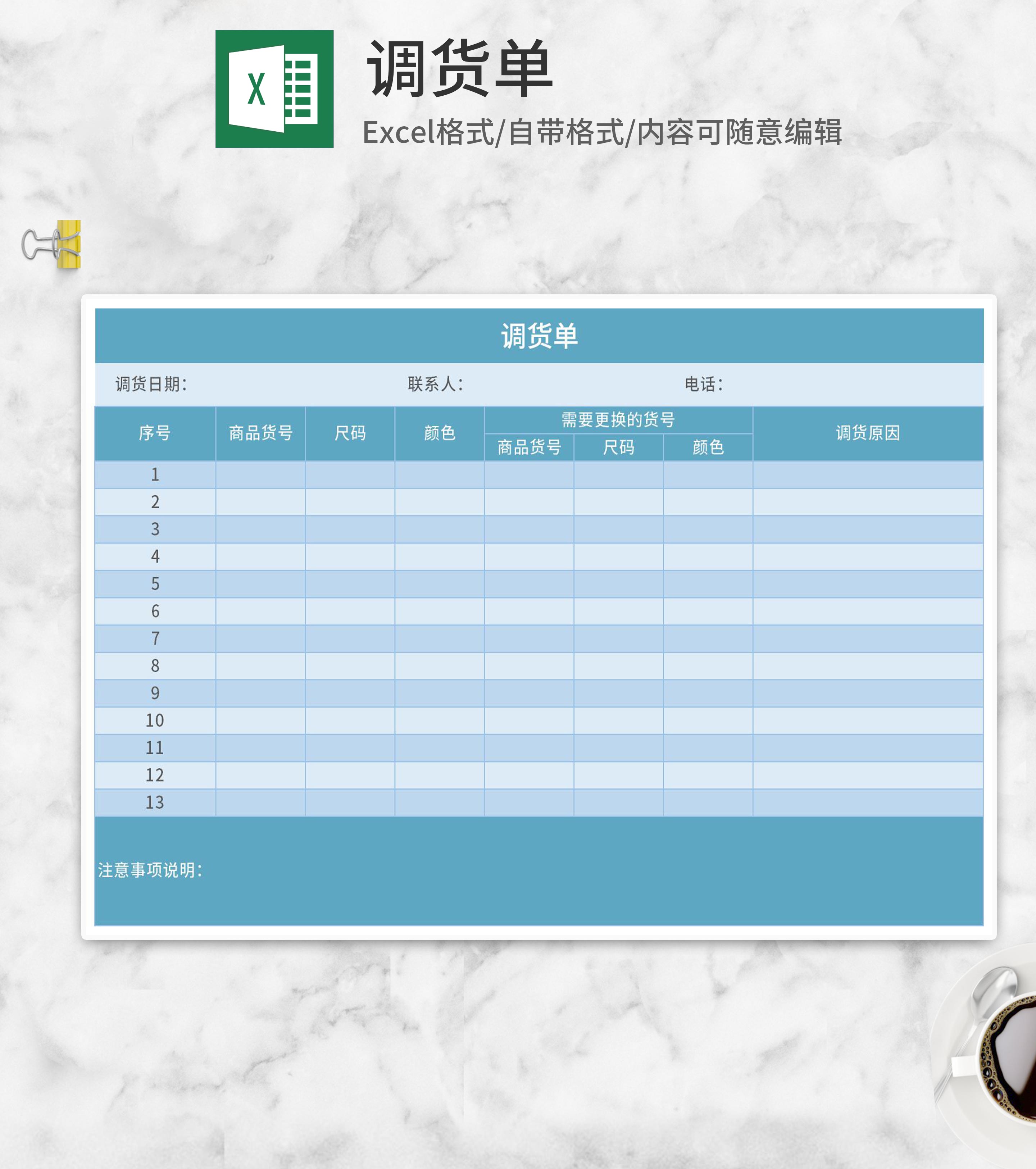 简约蓝色商品调货单Excel模板