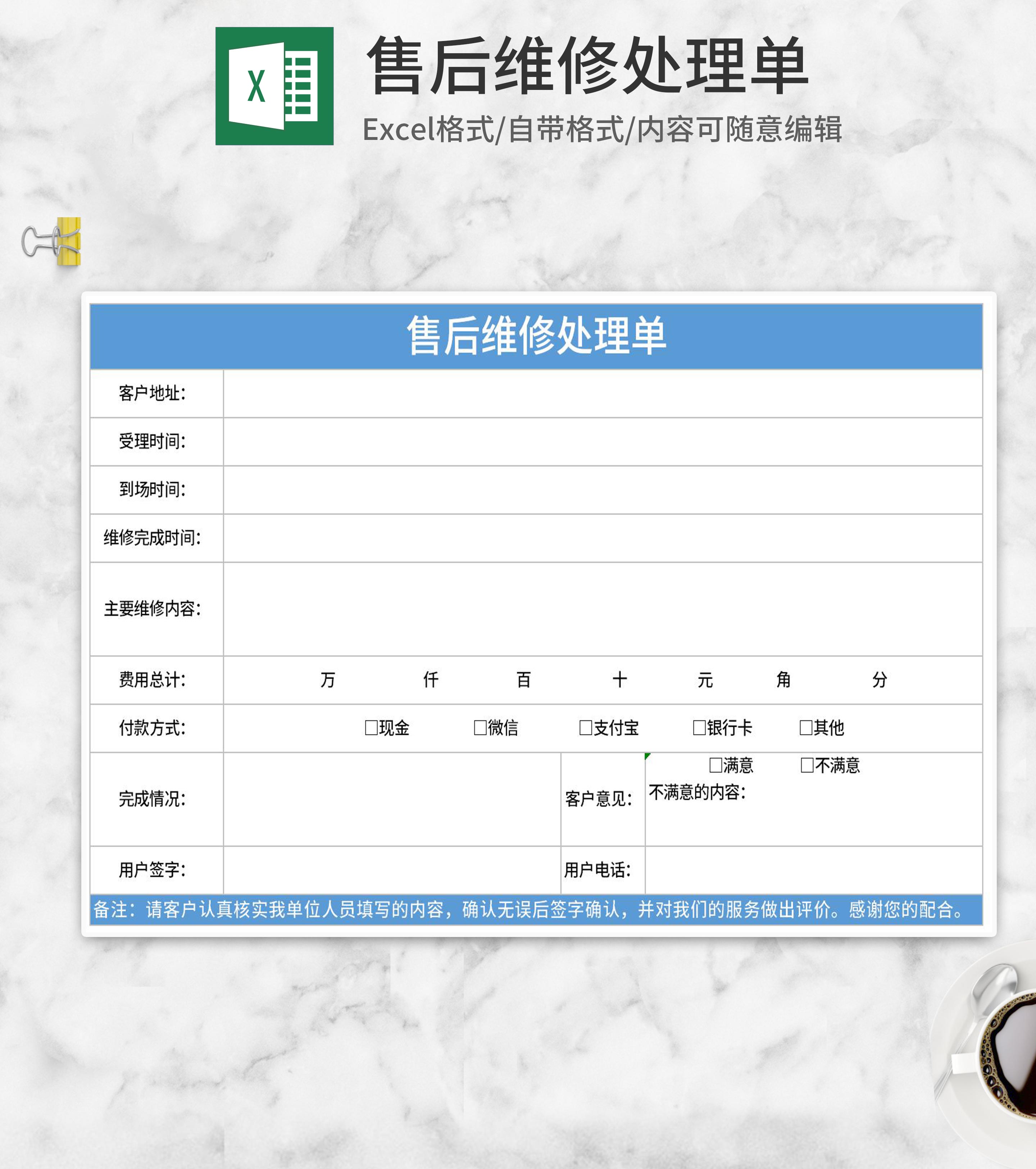 简约蓝色售后维修处理单Excel模板