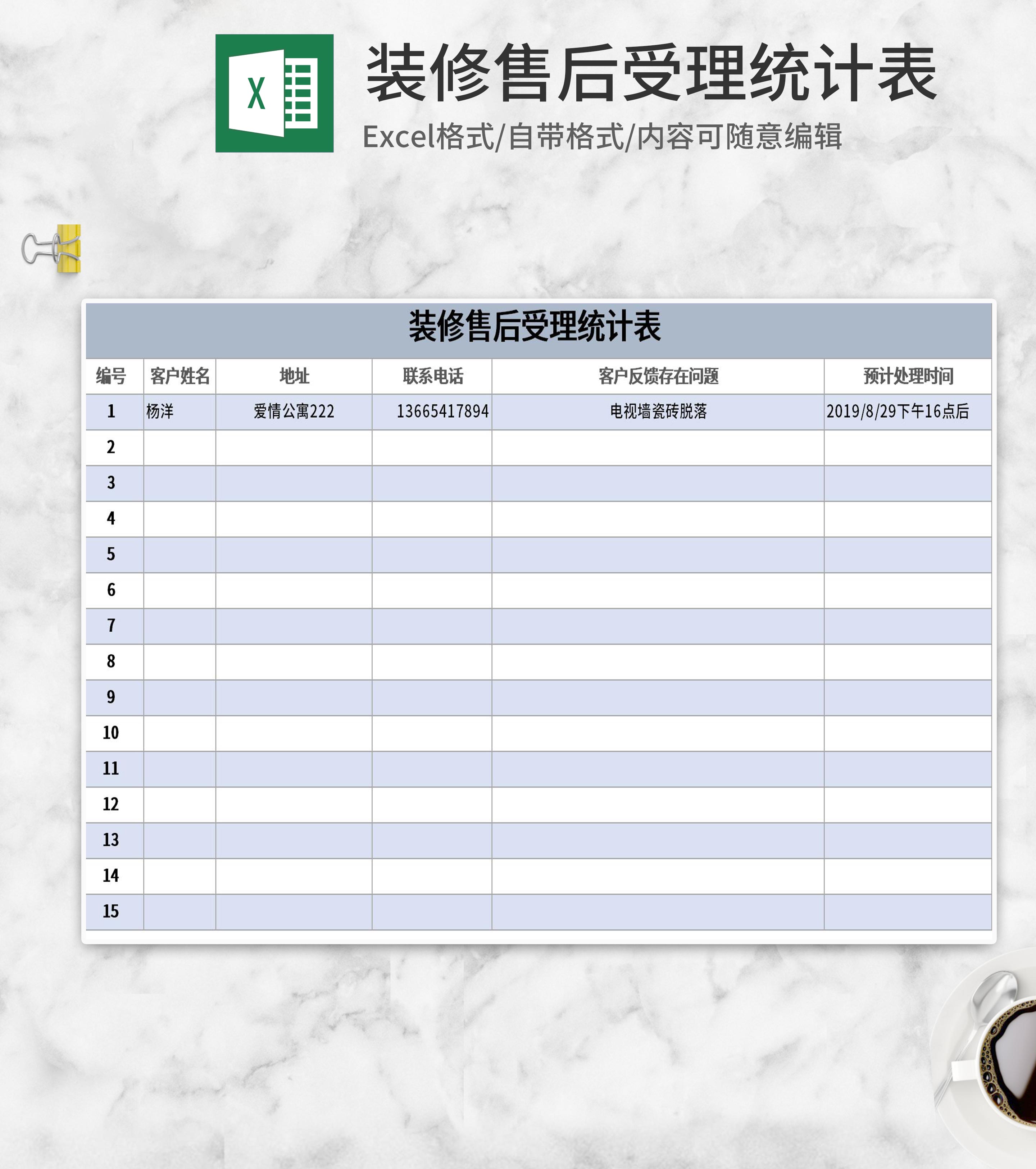 简约蓝色装修售后受理统计表Excel模板
