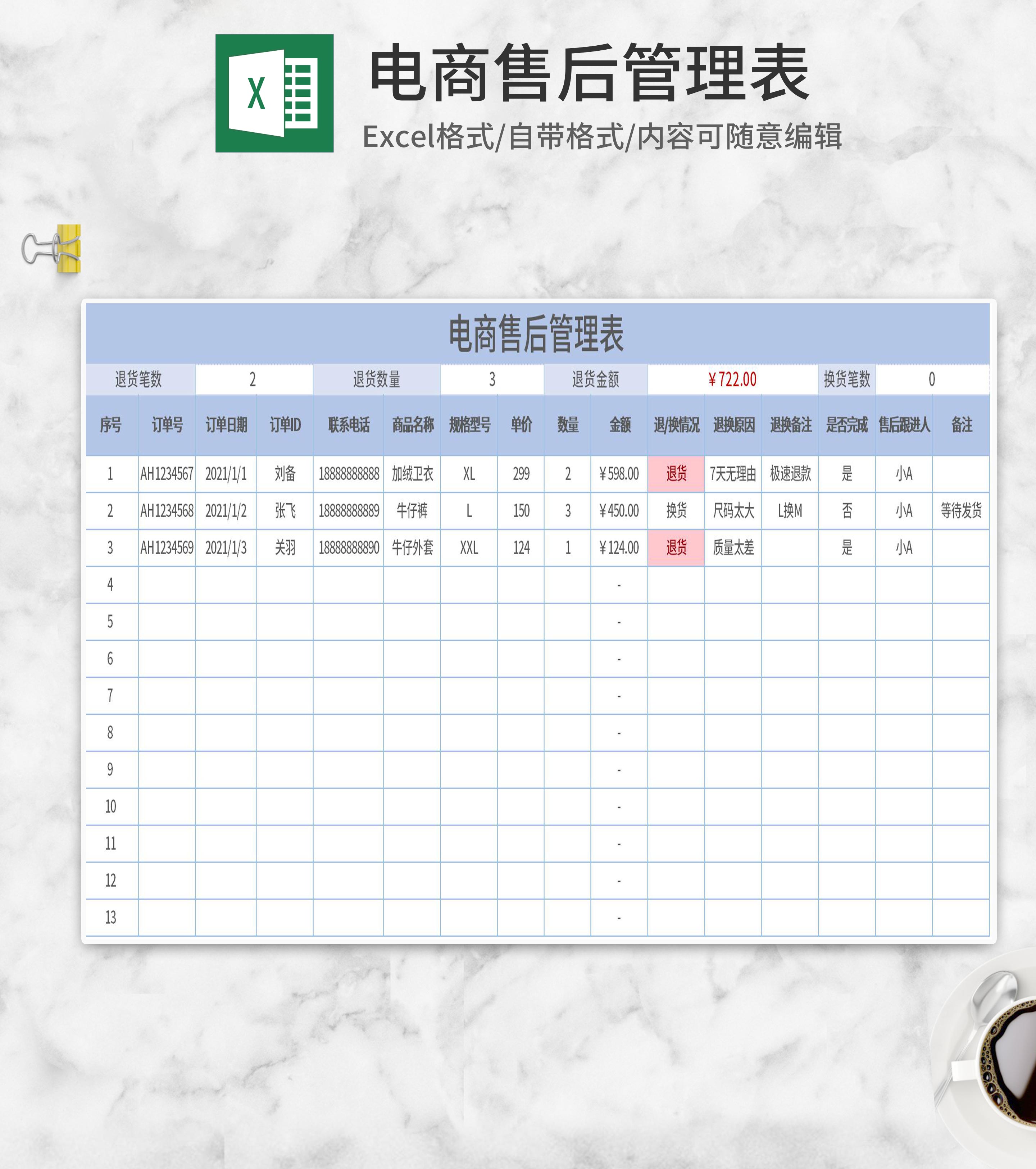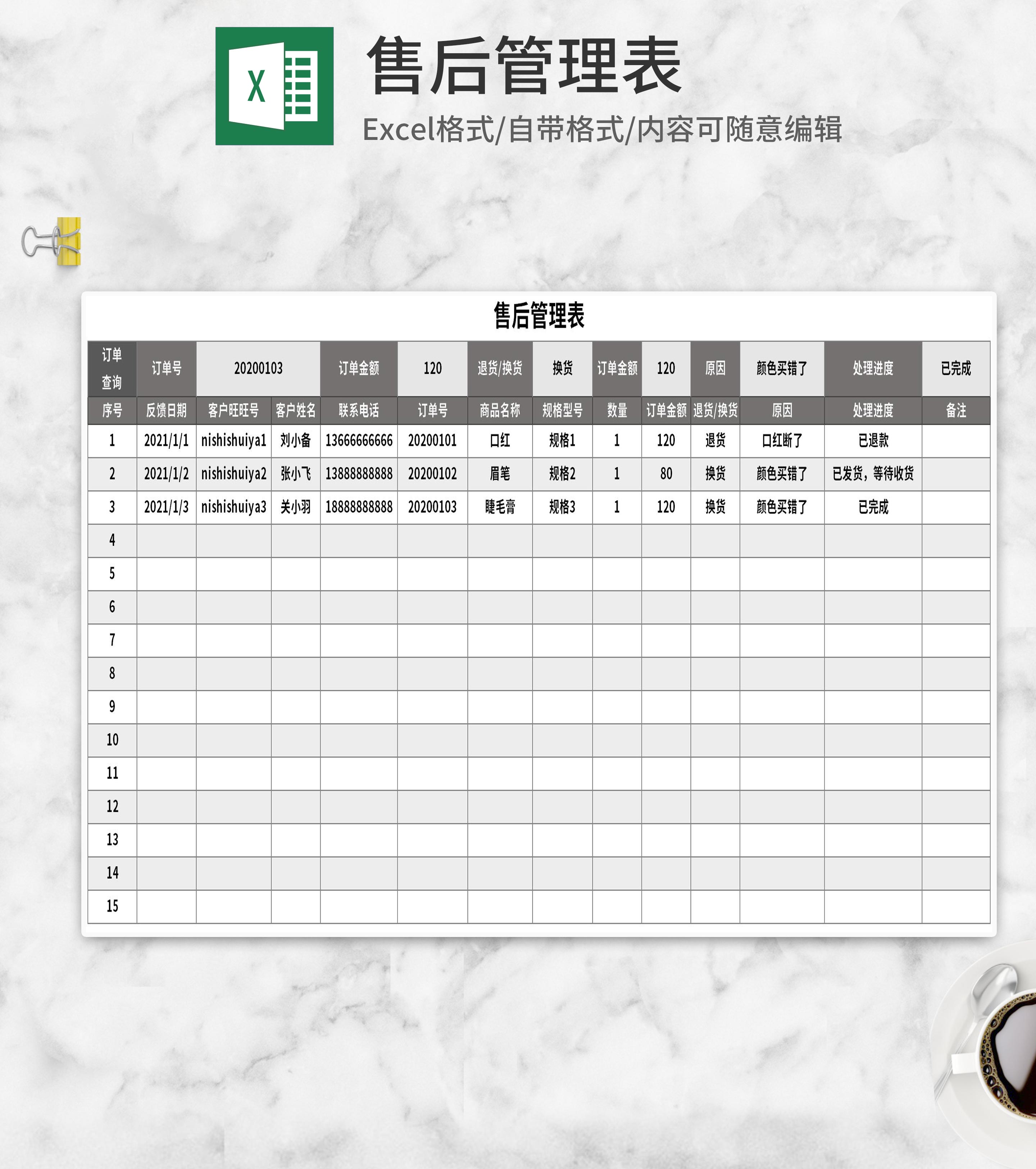 订单售后管理表Excel模板