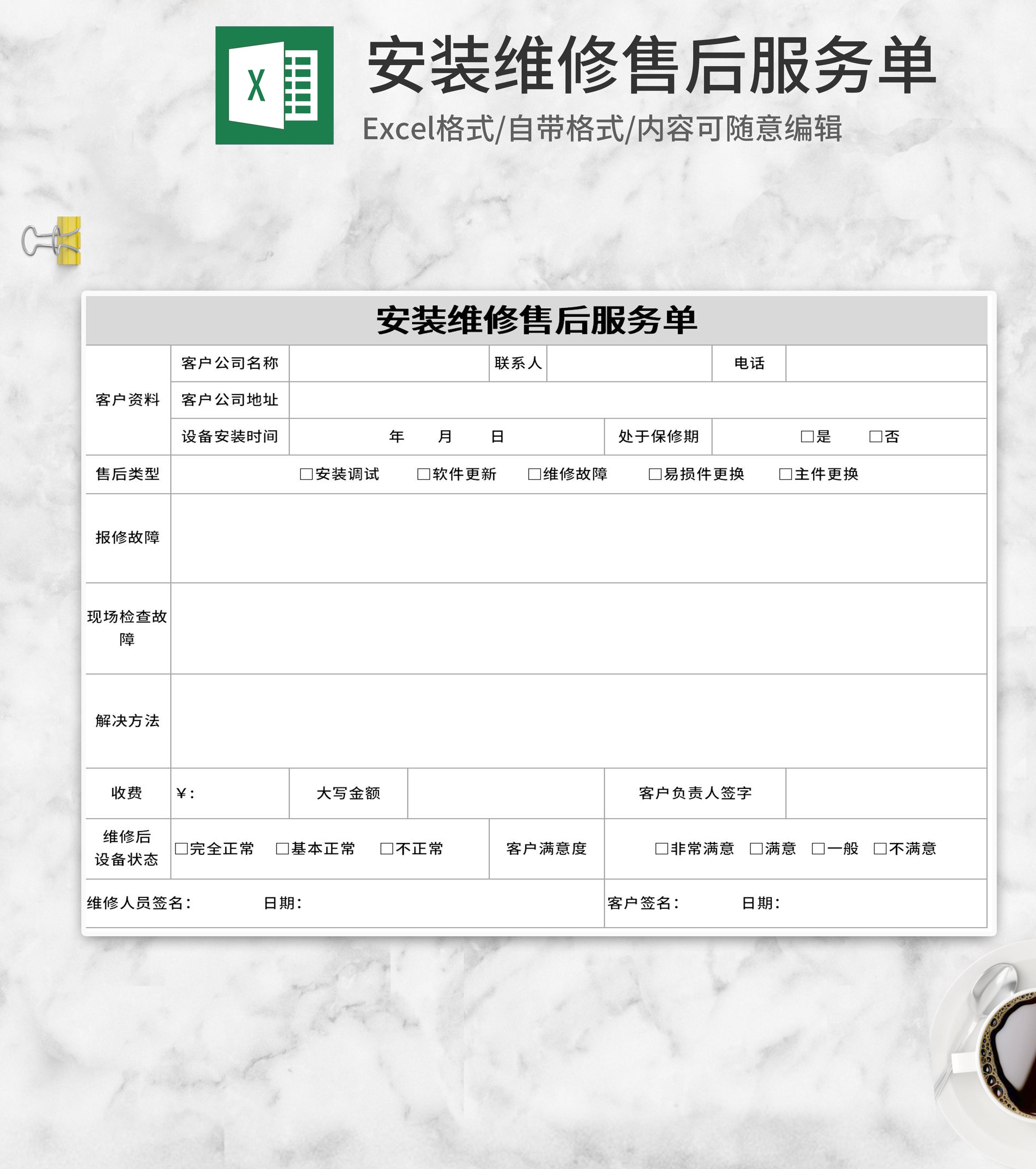 简约绿色售后服务维修单Excel模板
