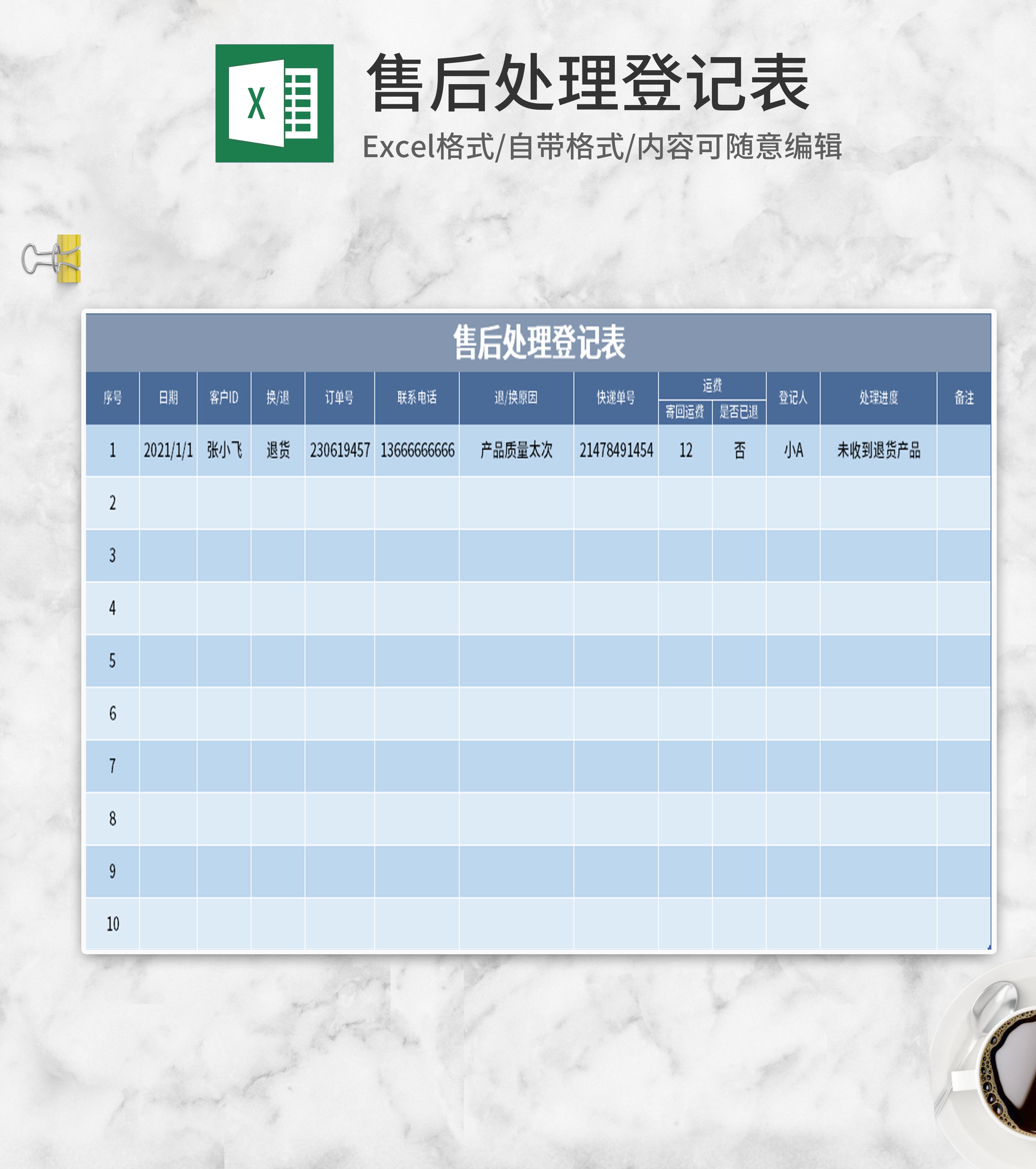 蓝色售后处理登记表Excel模板