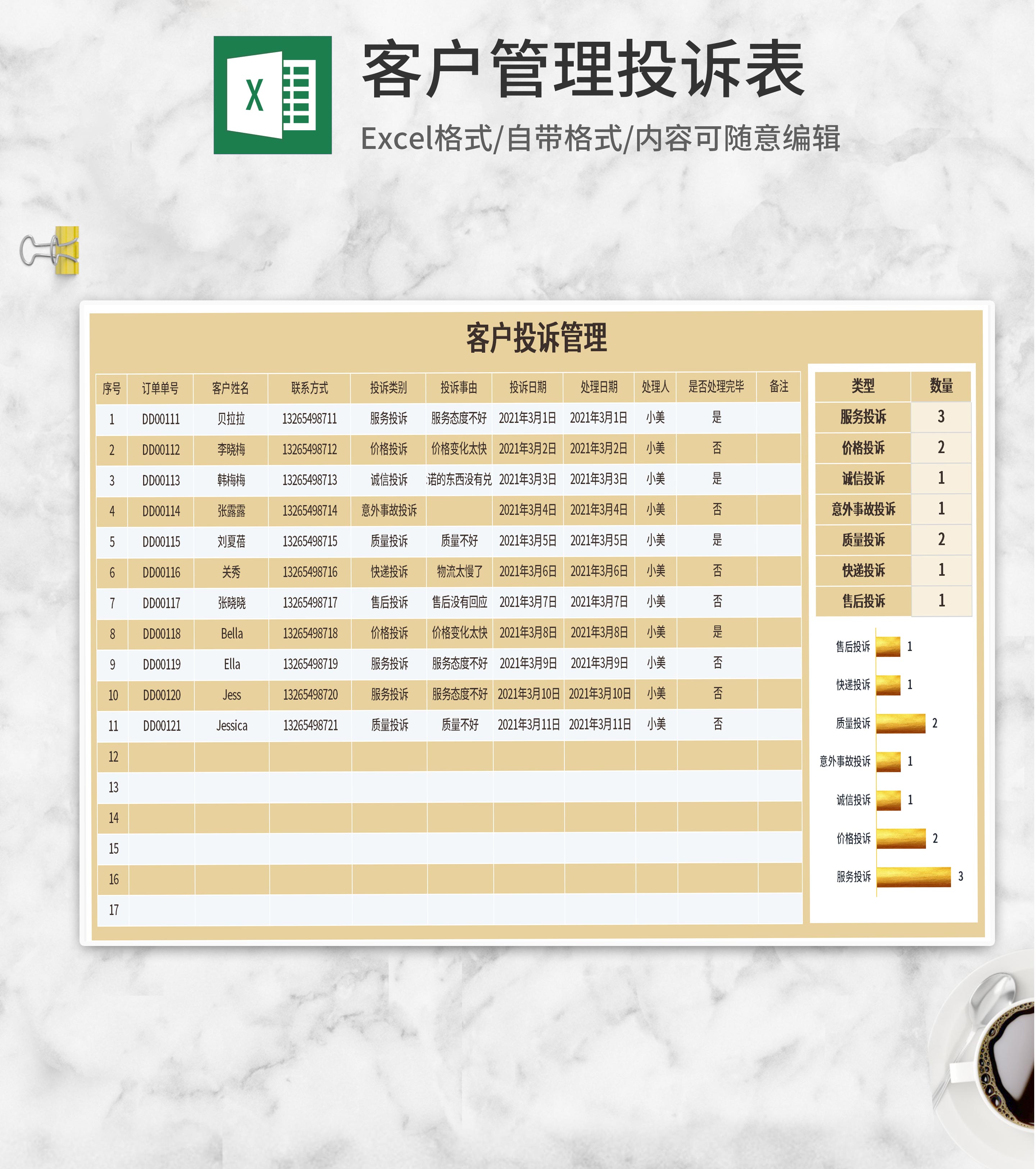 黄色客户管理投诉表Excel模板