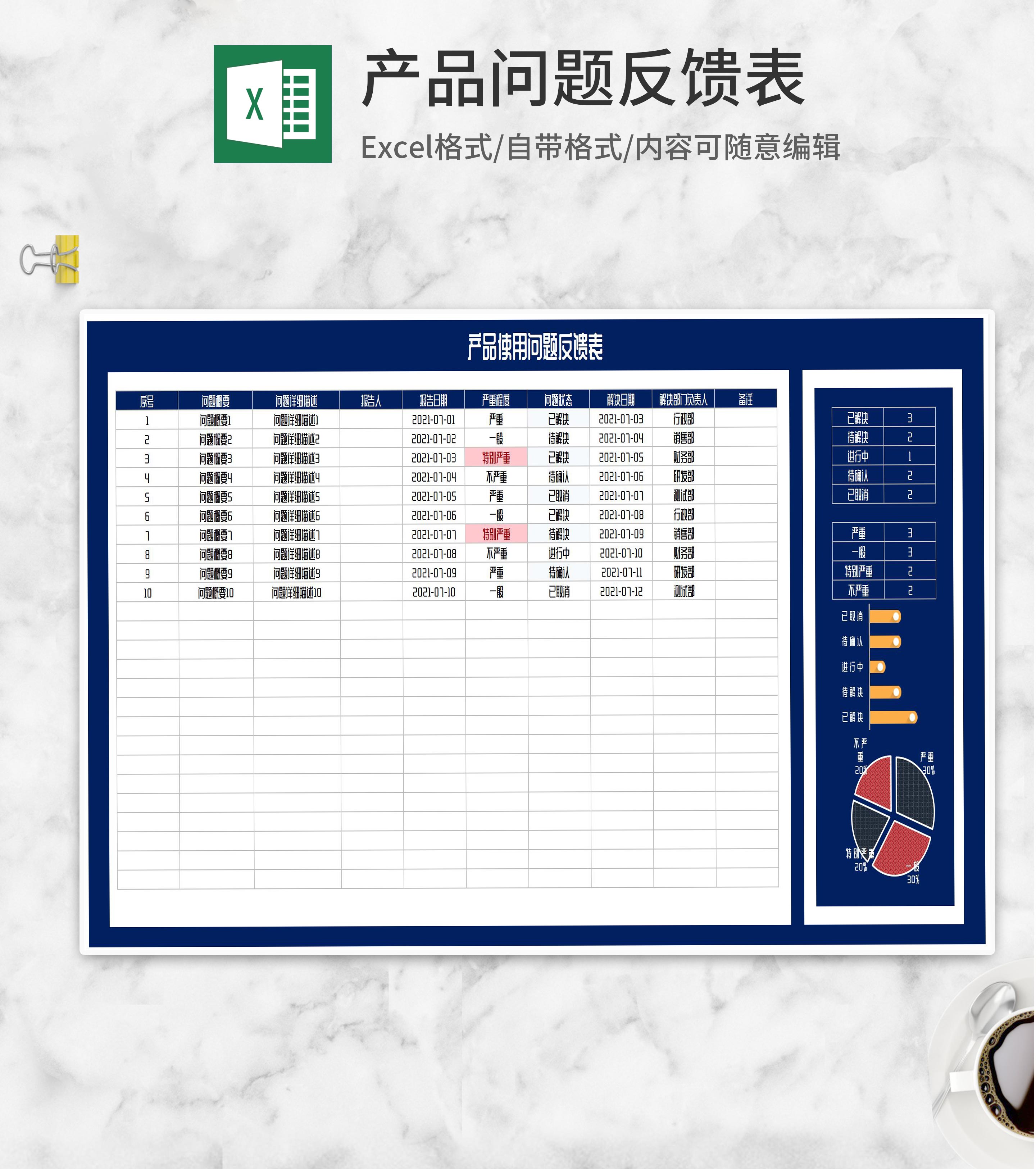 产品使用问题反馈统计表Excel模板