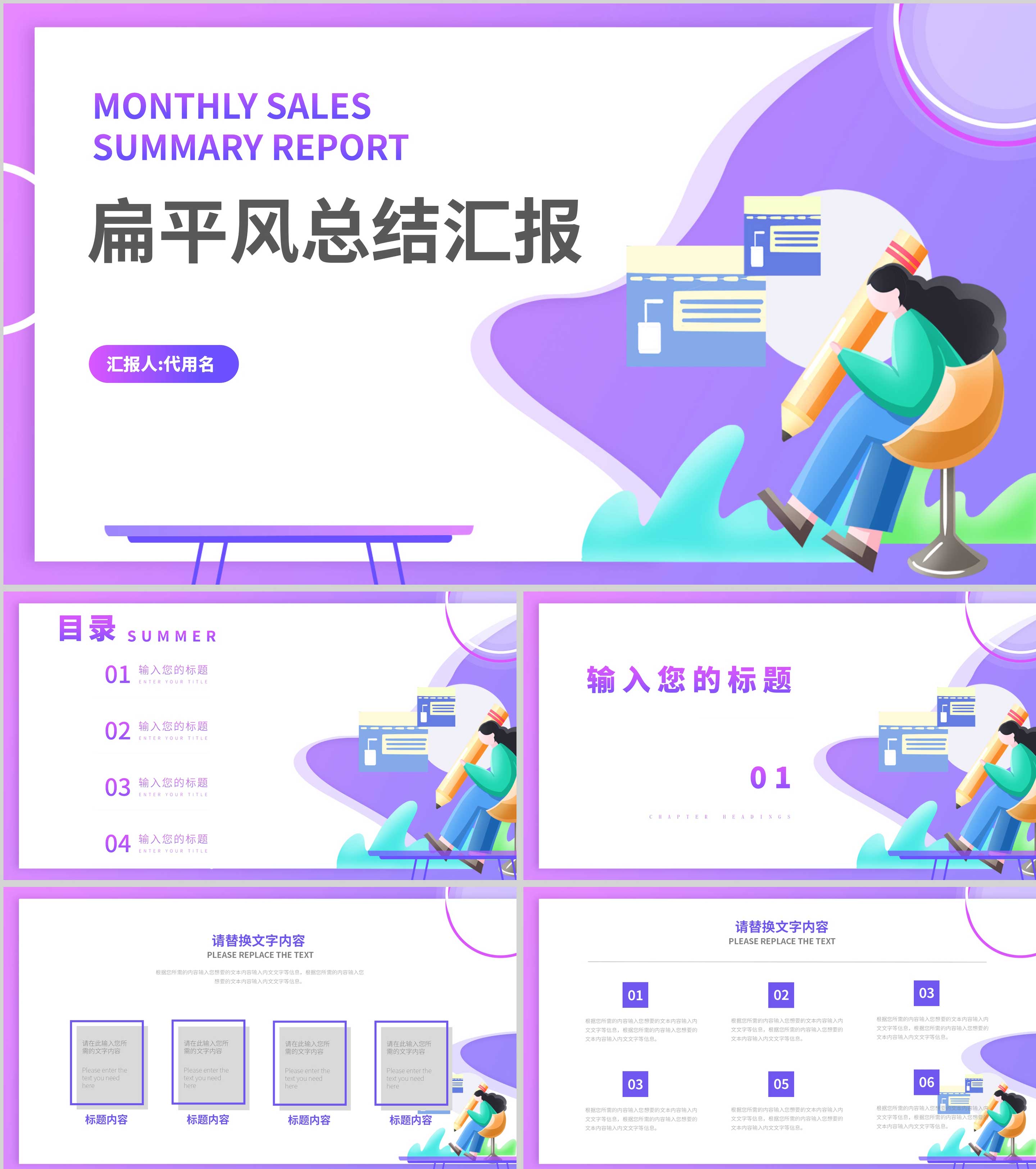 紫色插画风总结汇报PPT模板