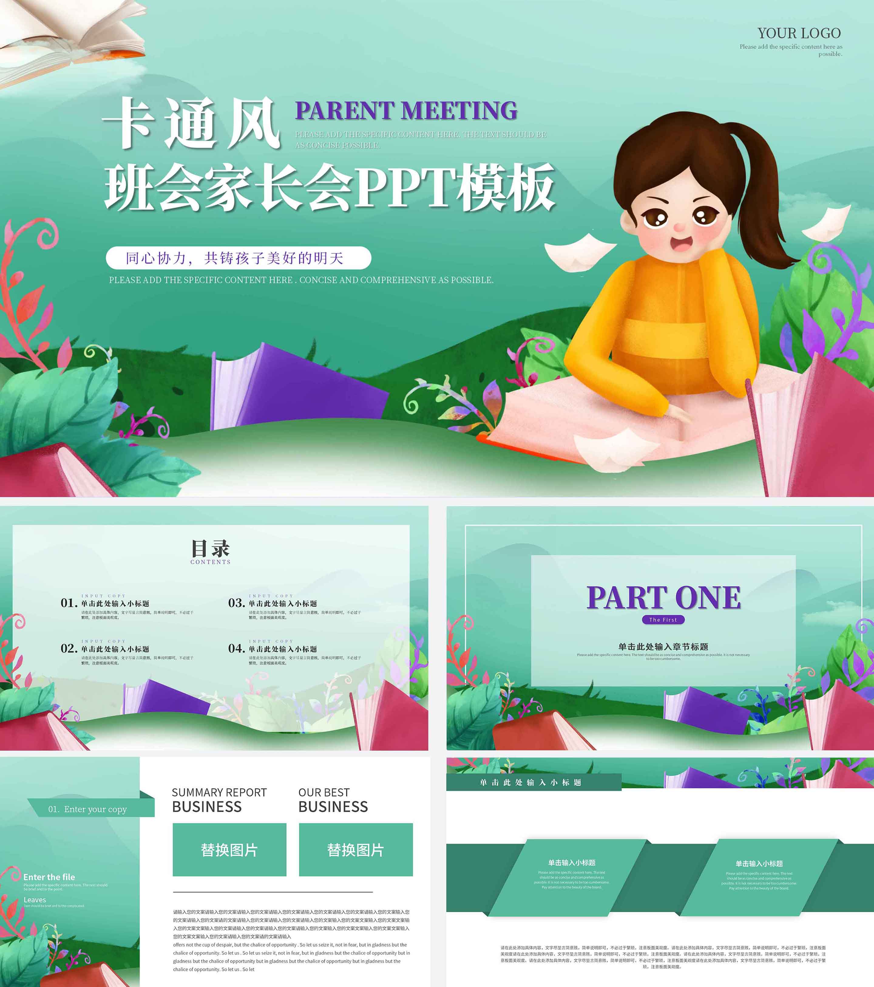 绿色女孩卡通风班会家长会PPT模板