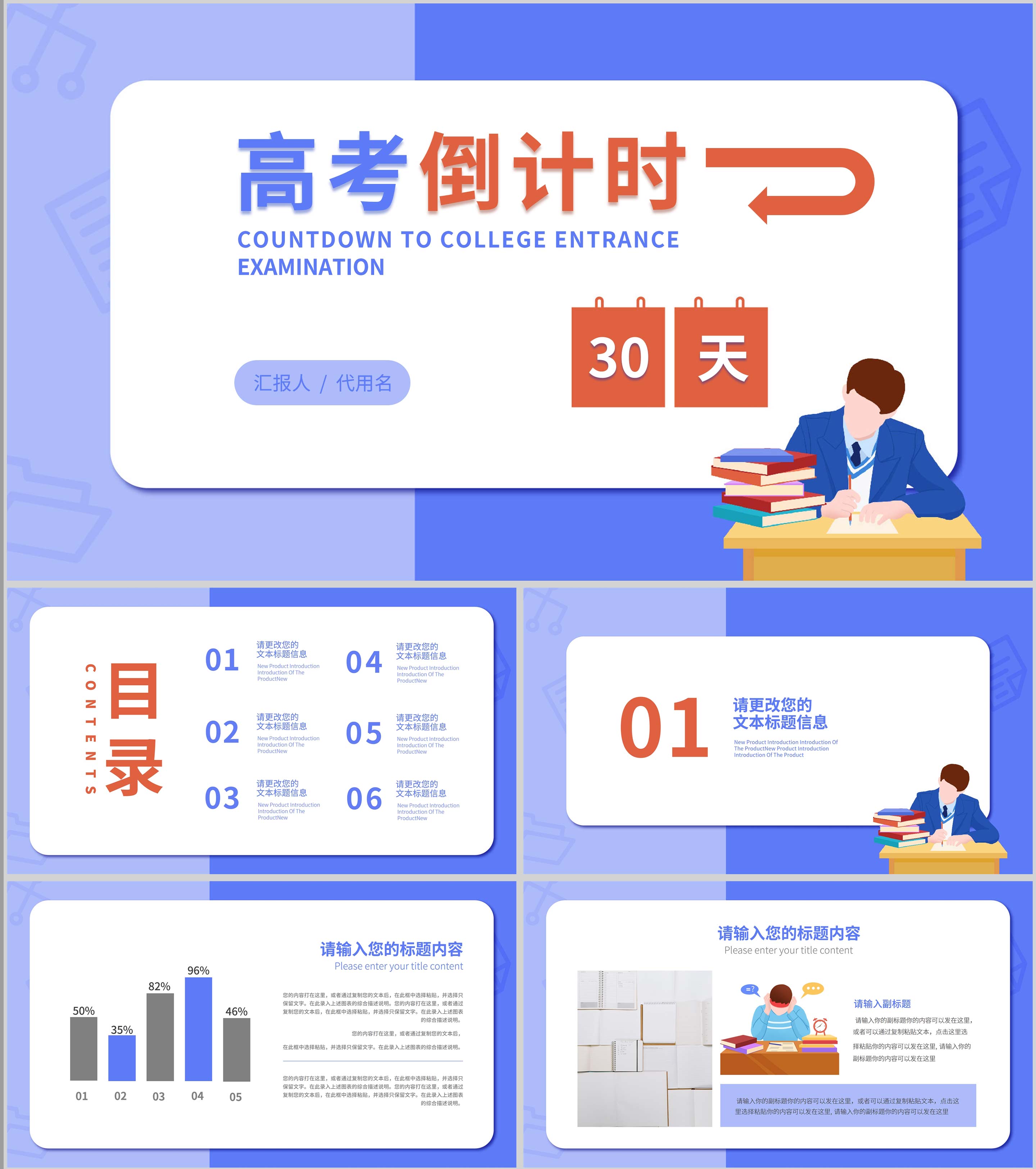 蓝色插画风高考倒计时PPT模板