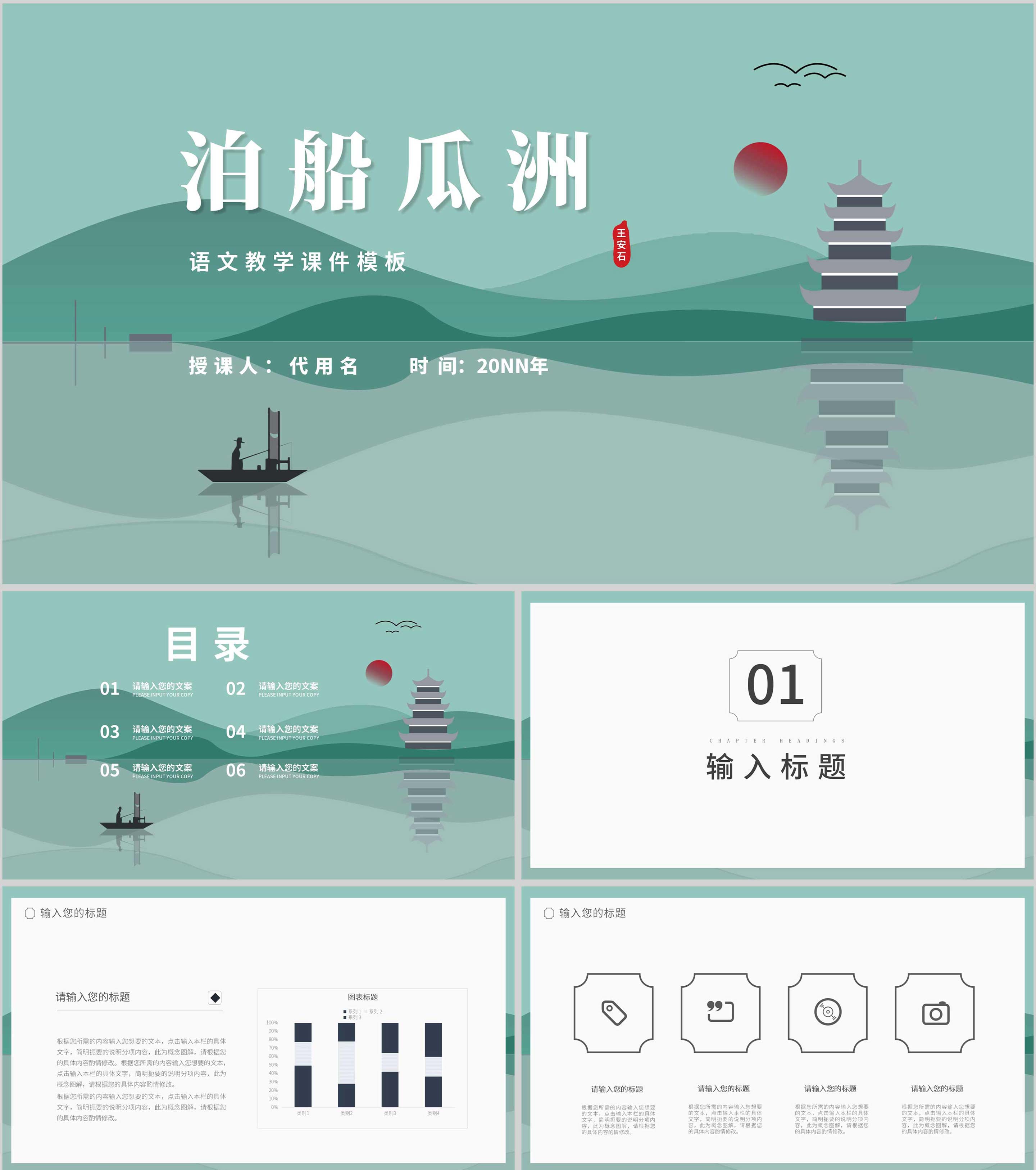 小清新中国风泊船瓜洲语文古诗词教学PPT模板