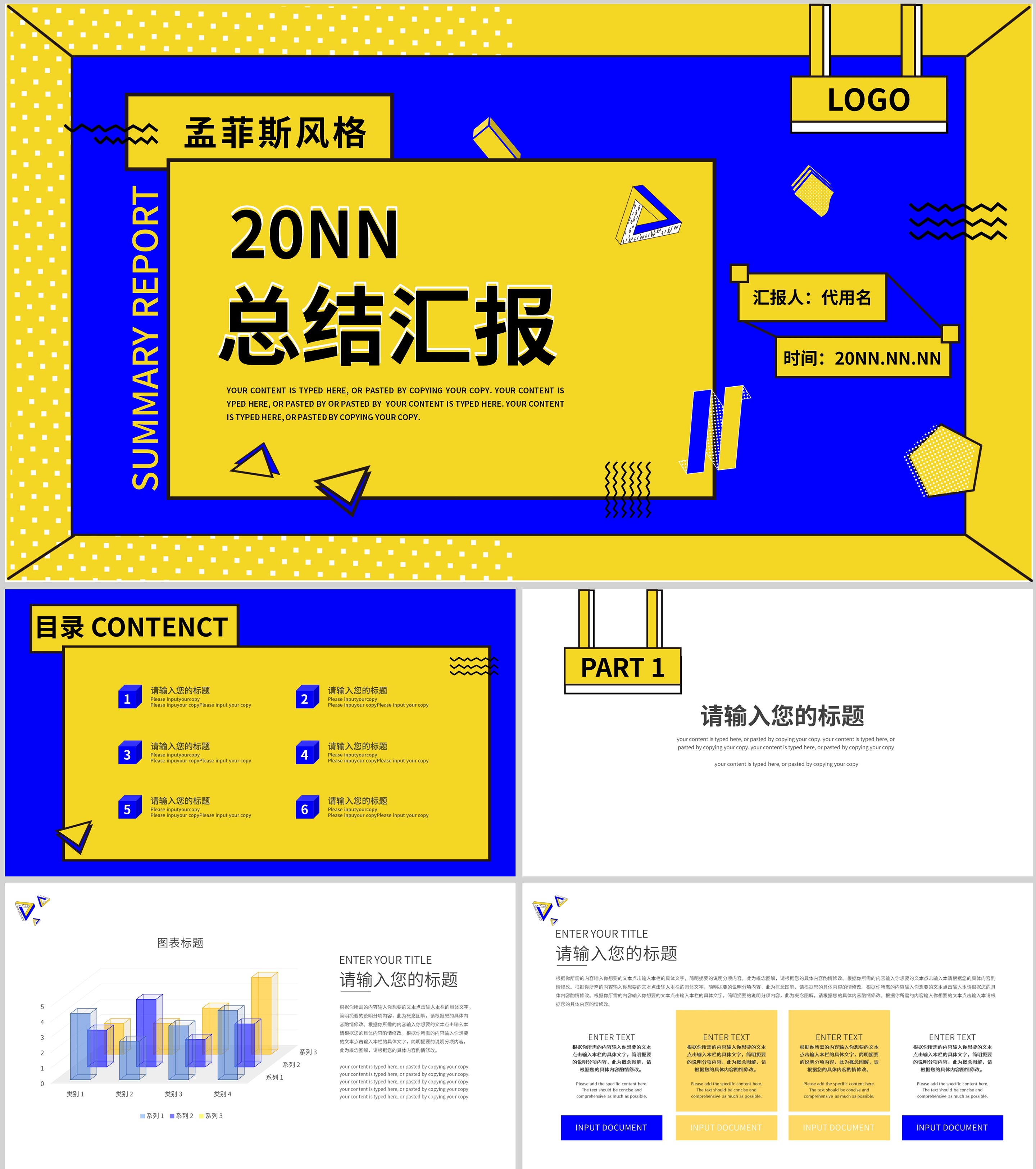 黄蓝拼色孟菲斯风格总结汇报PPT模板