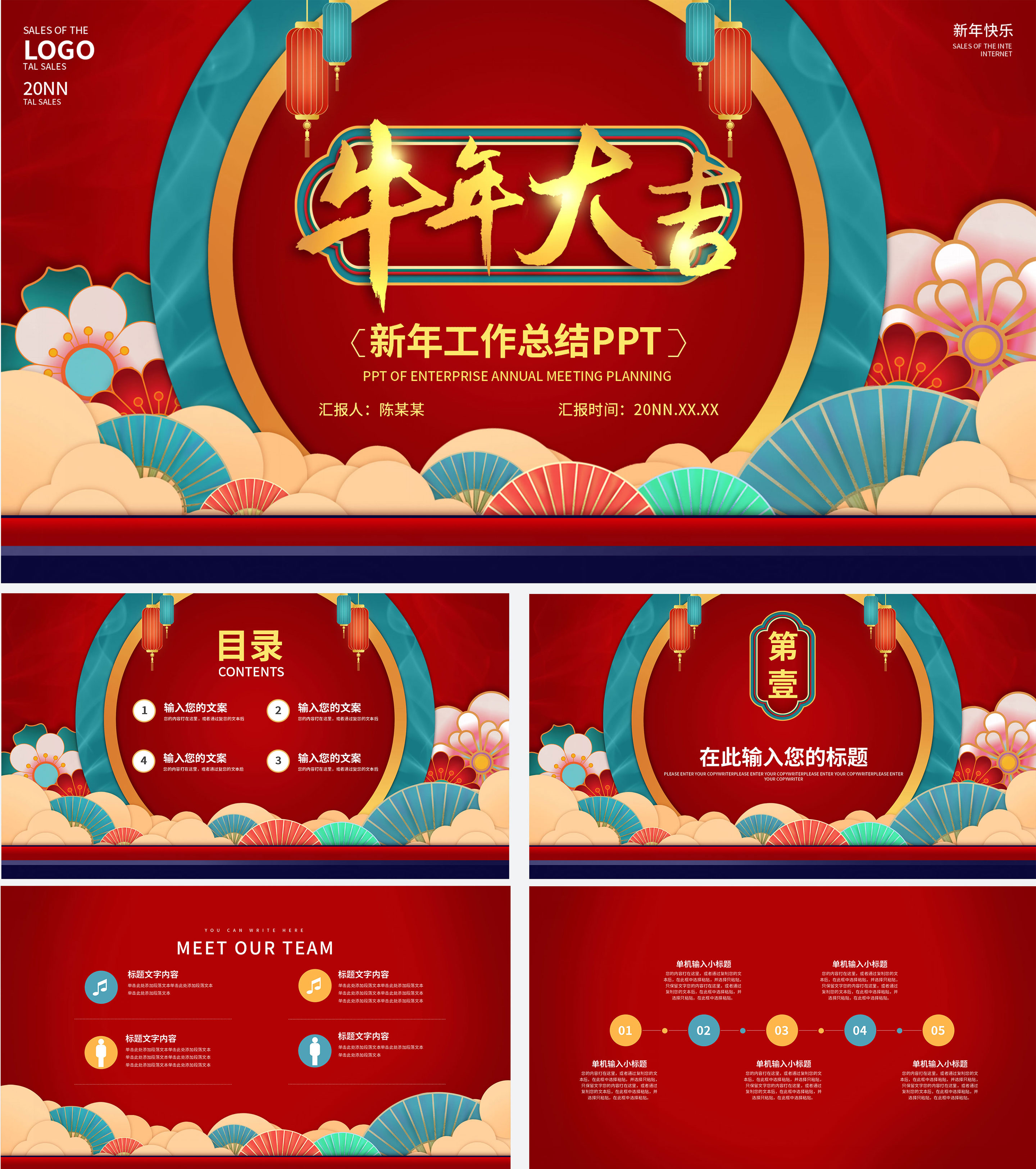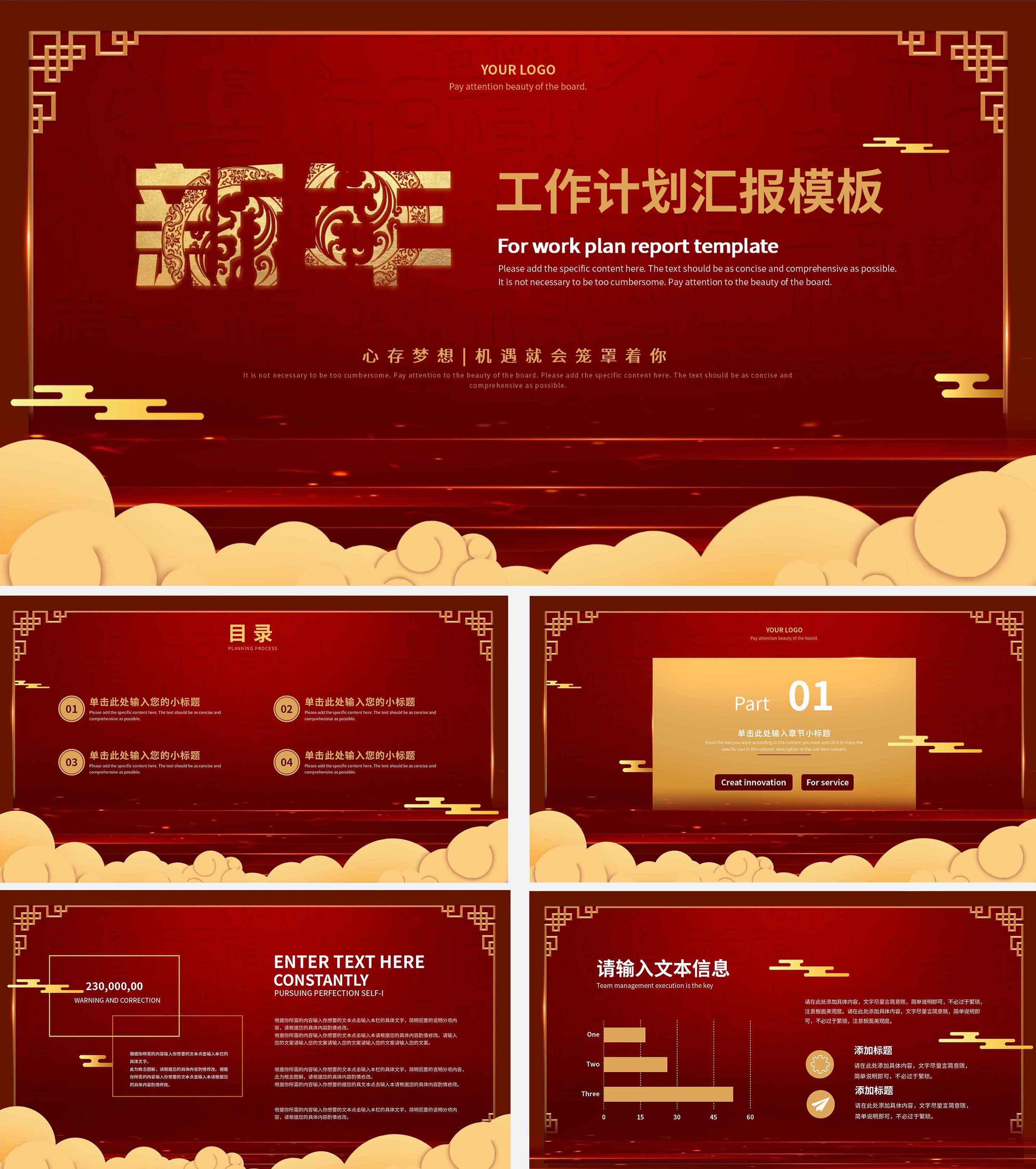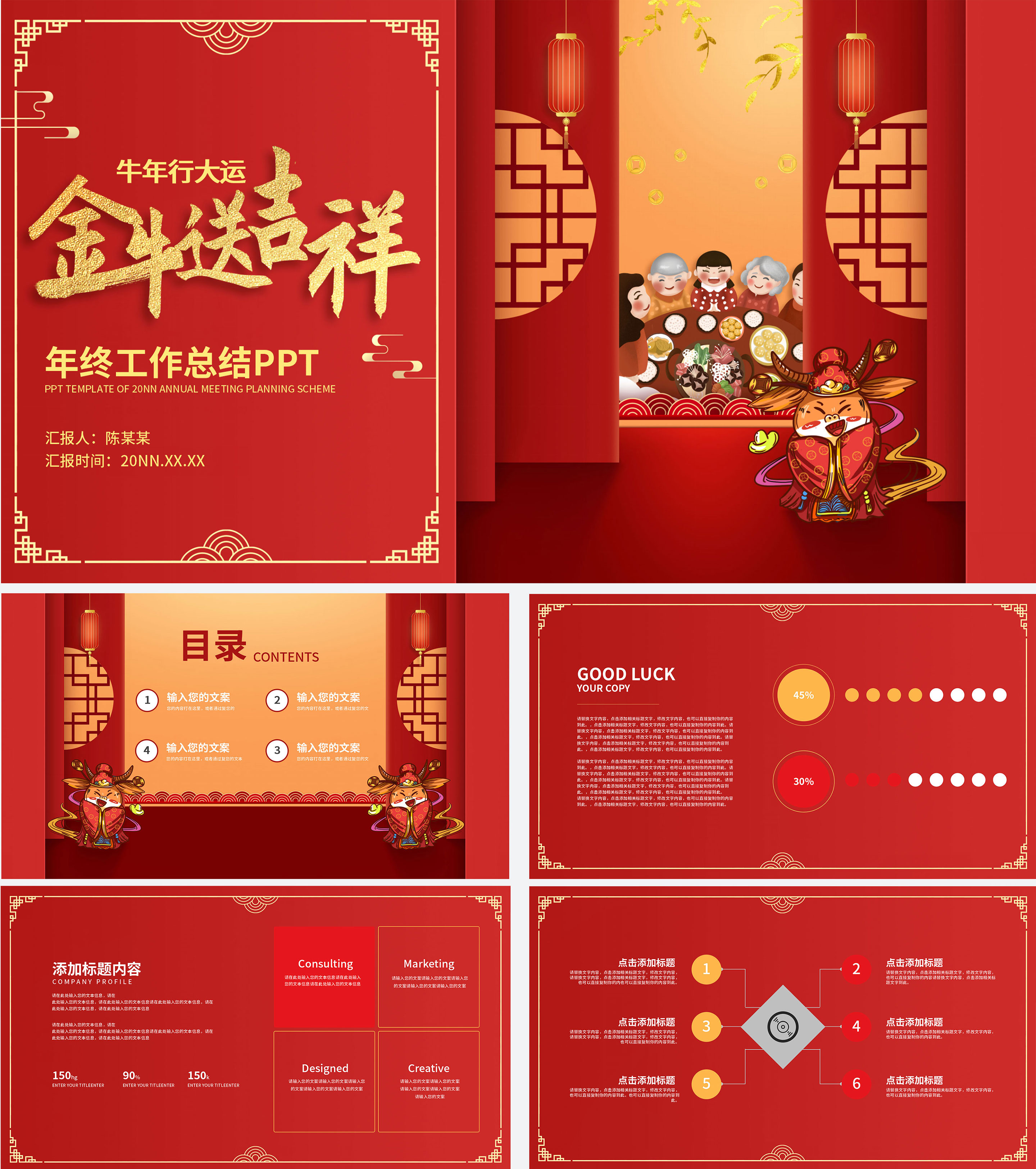 大红牛年中式总结汇报PPT模板