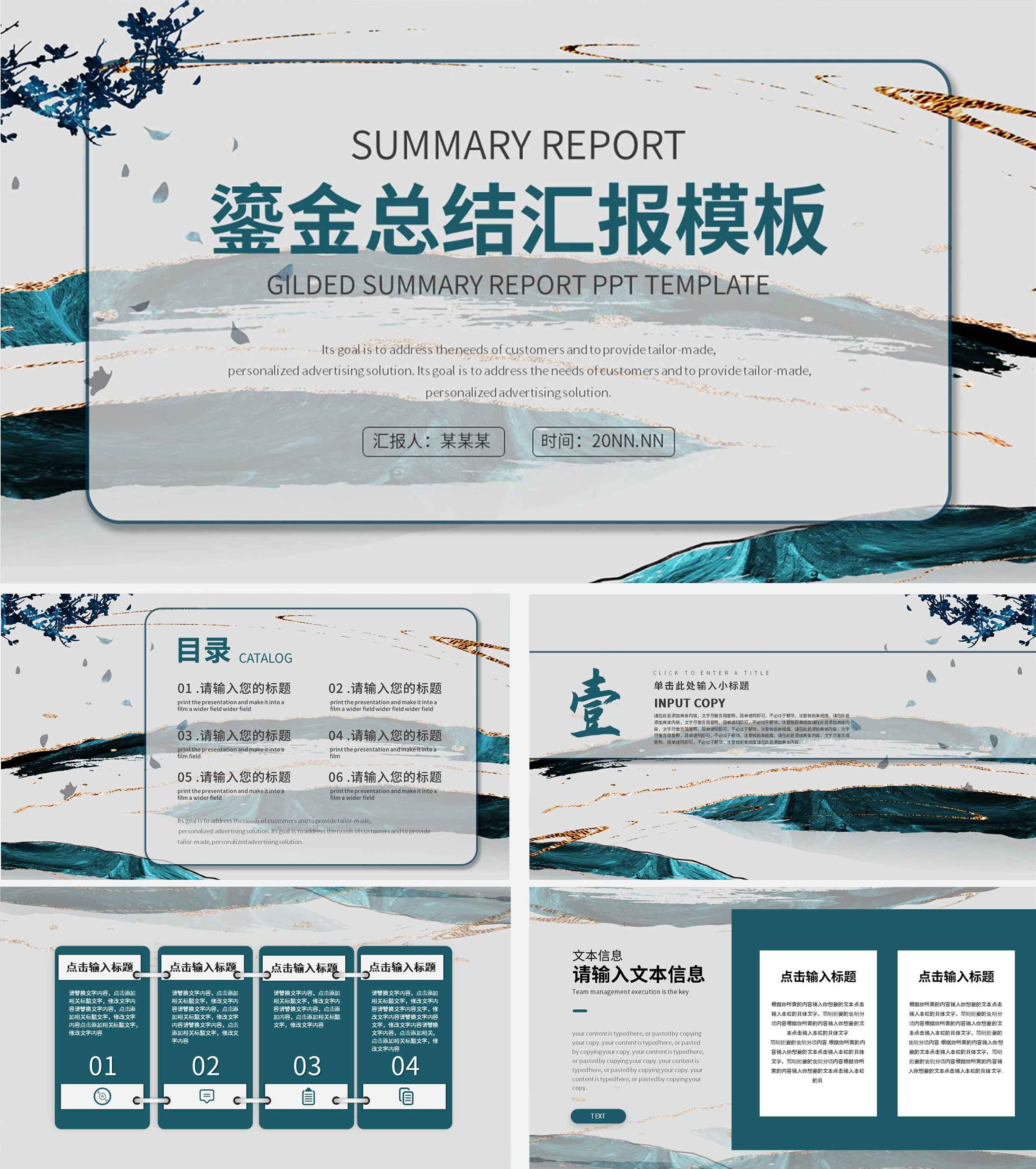 蓝色古风鎏金总结汇报PPT模板