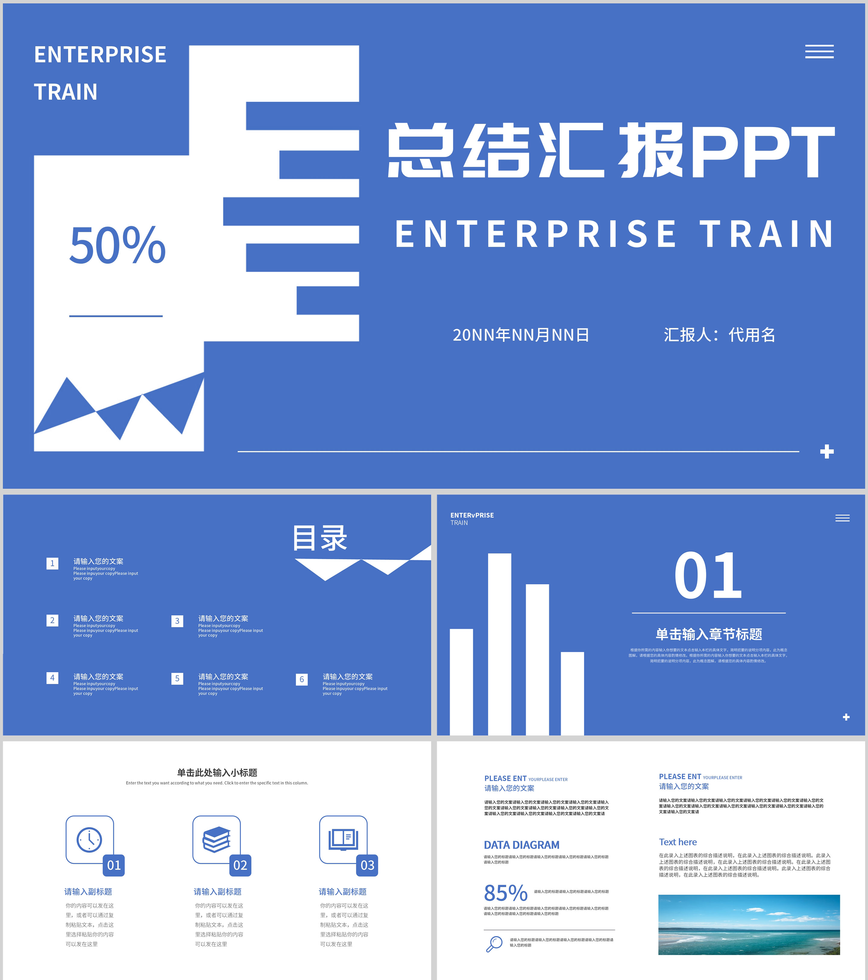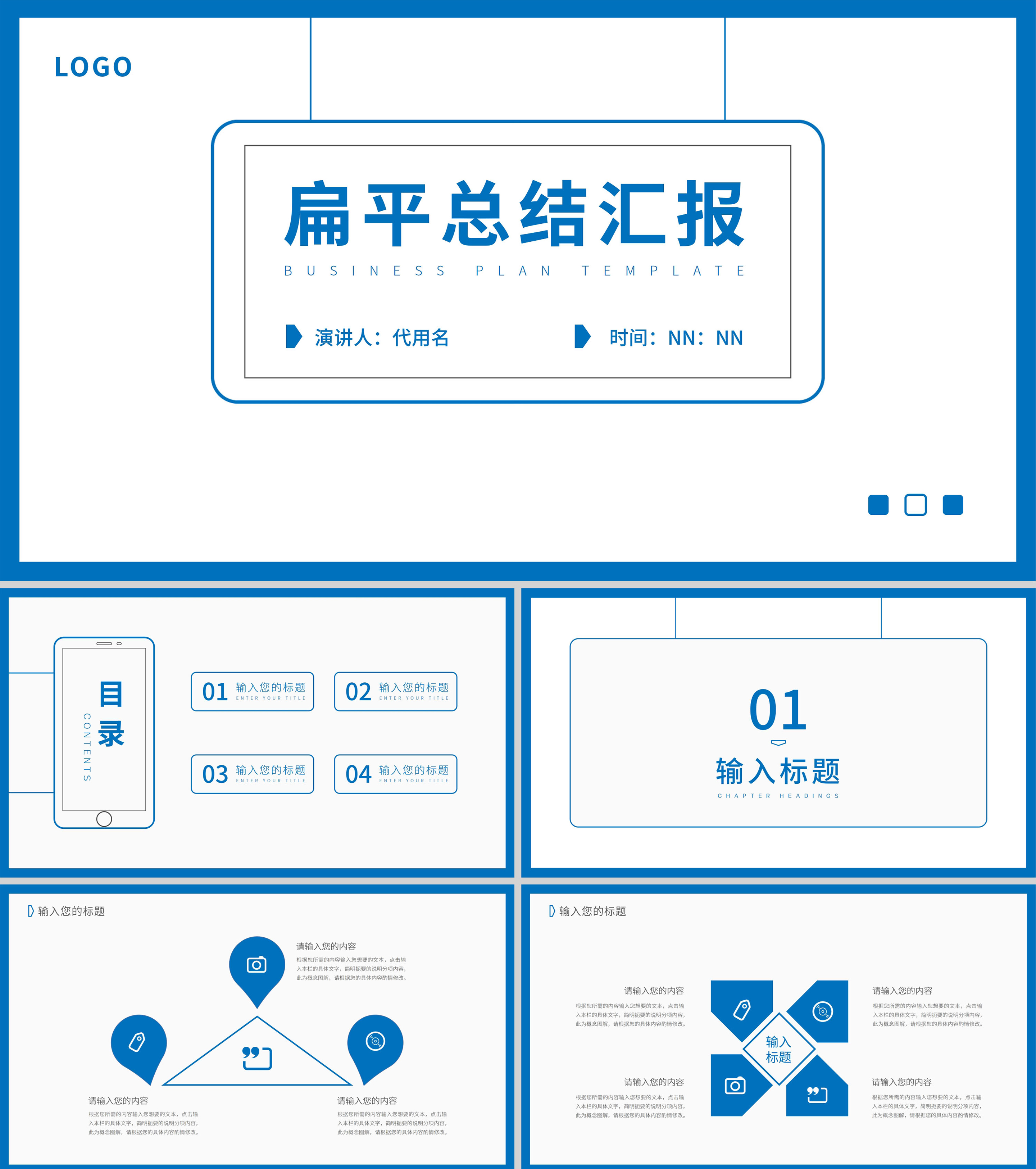 蓝色简约扁平风总结汇报PPT模板