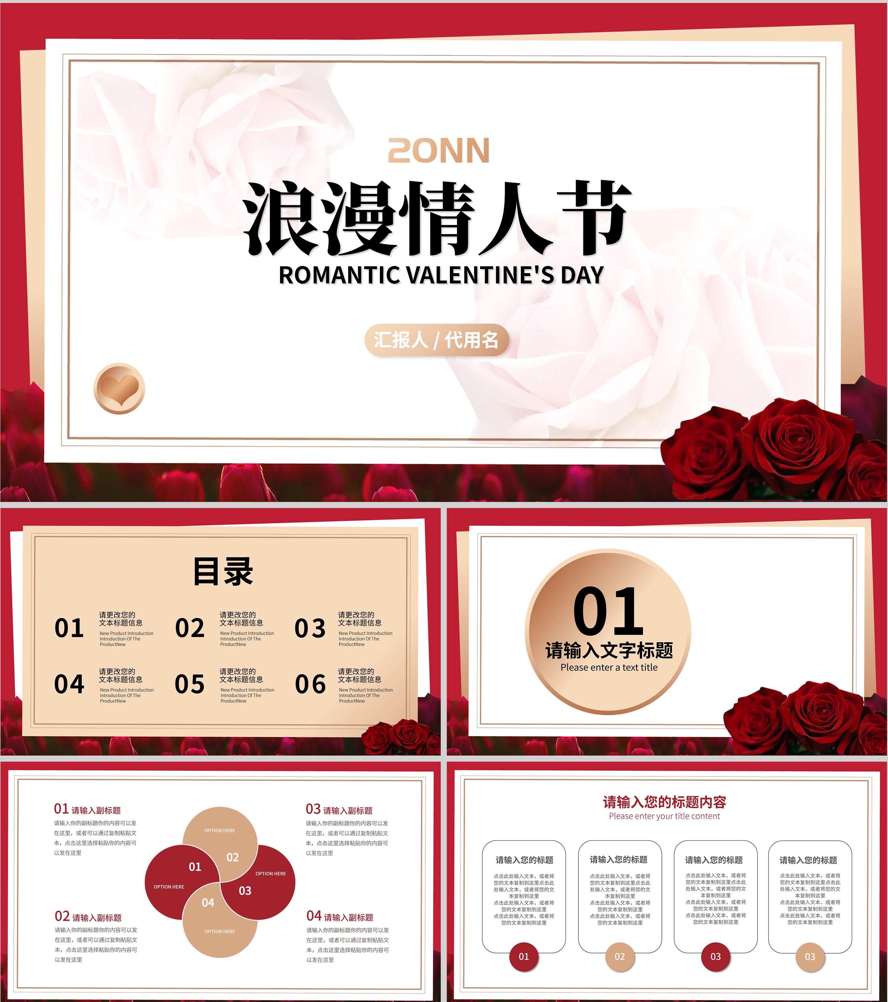 红色画册风玫瑰花浪漫情人节节日PPT模板