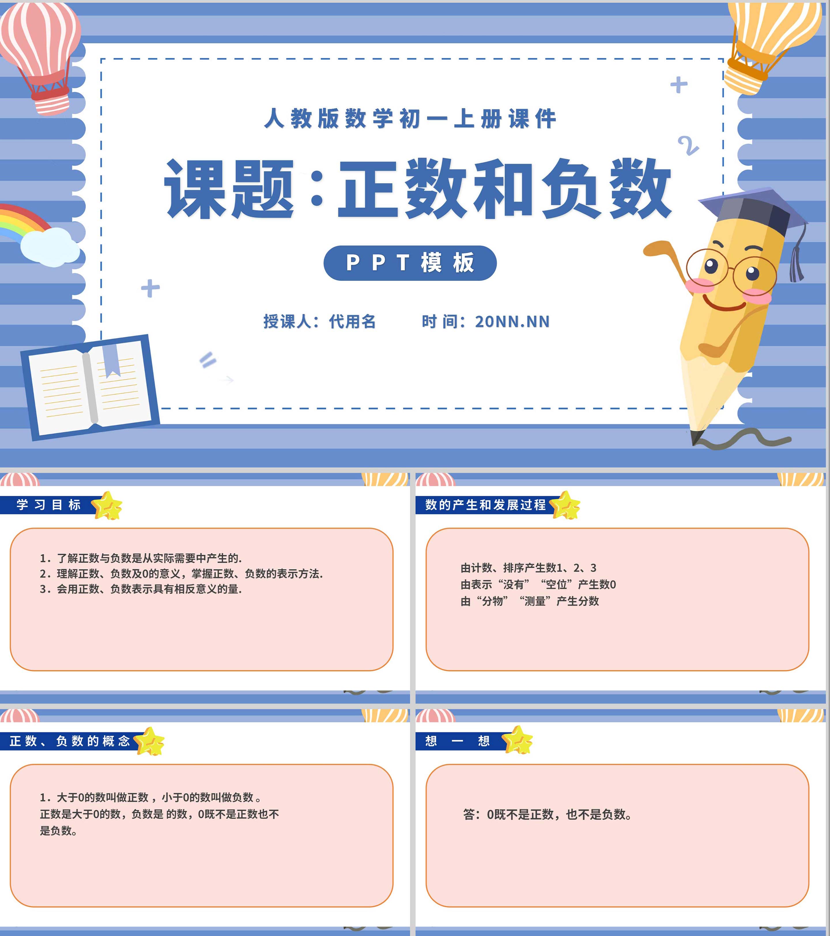 蓝色卡通风初一数学上册正数和负数课件PPT模板