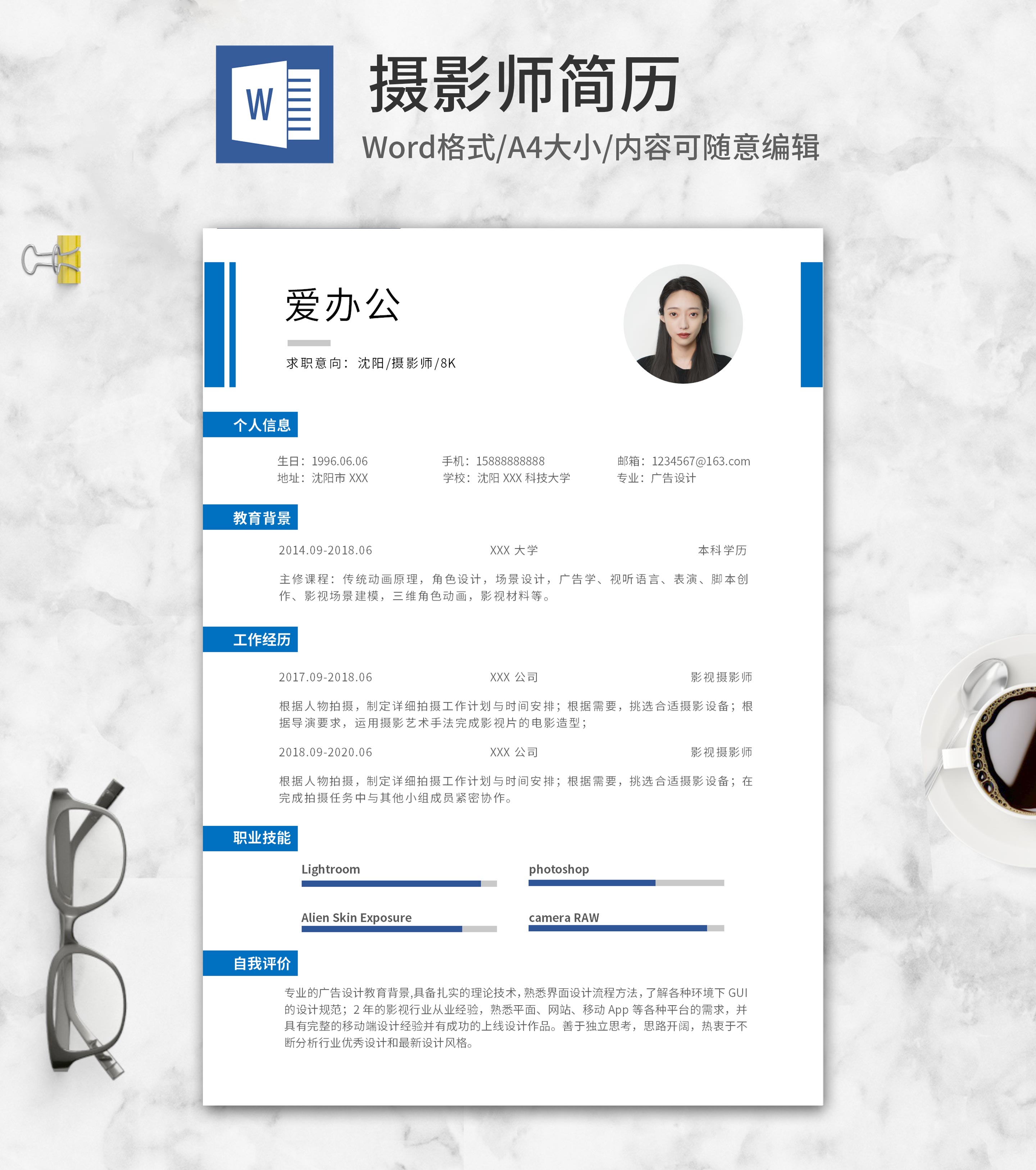 蓝色书签式摄影师求职简历word模板