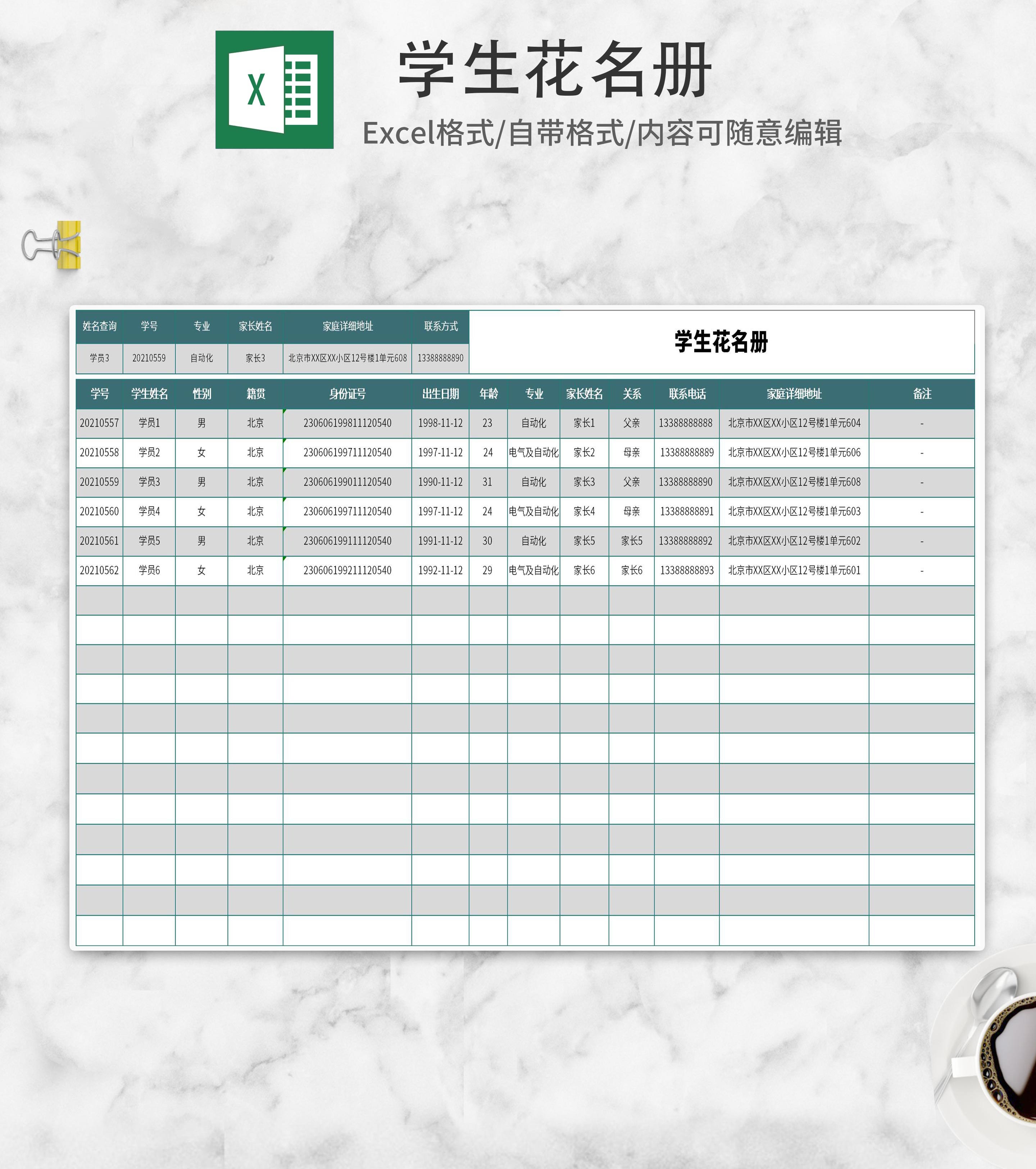 简约灰绿学生花名册Excel模板