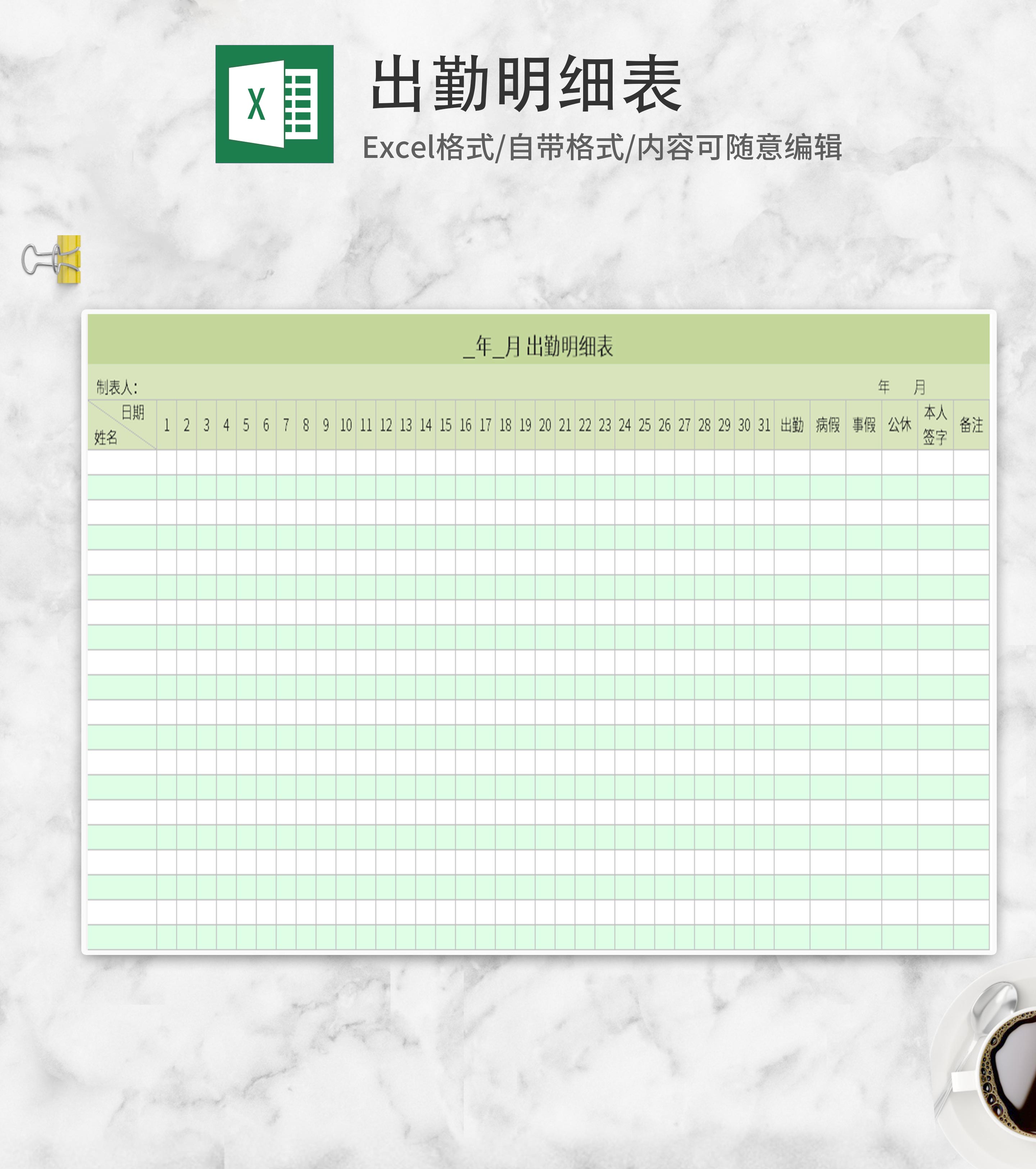 绿色出勤明细表Excel模板