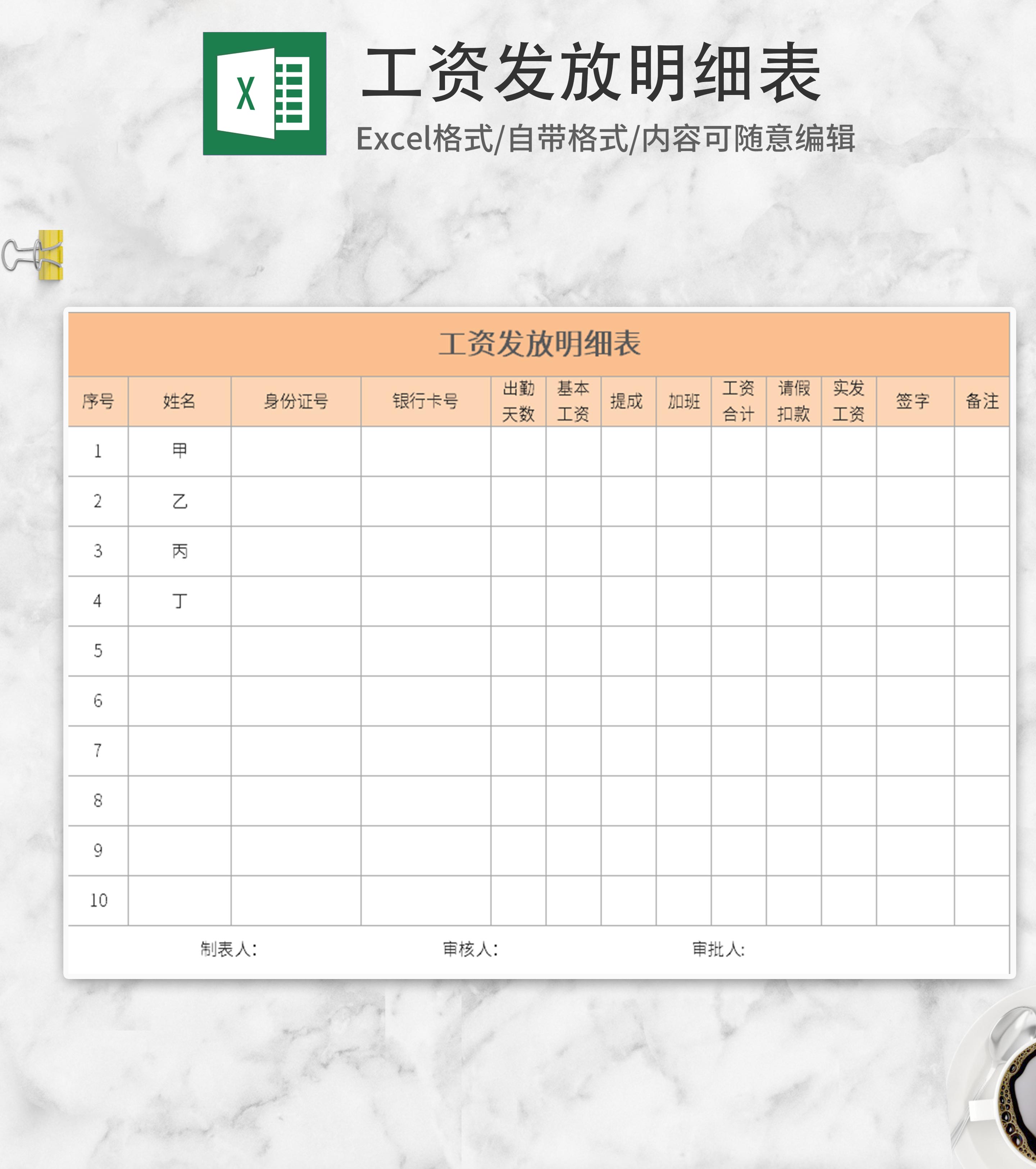 黄色工资发放明细表Excel模板